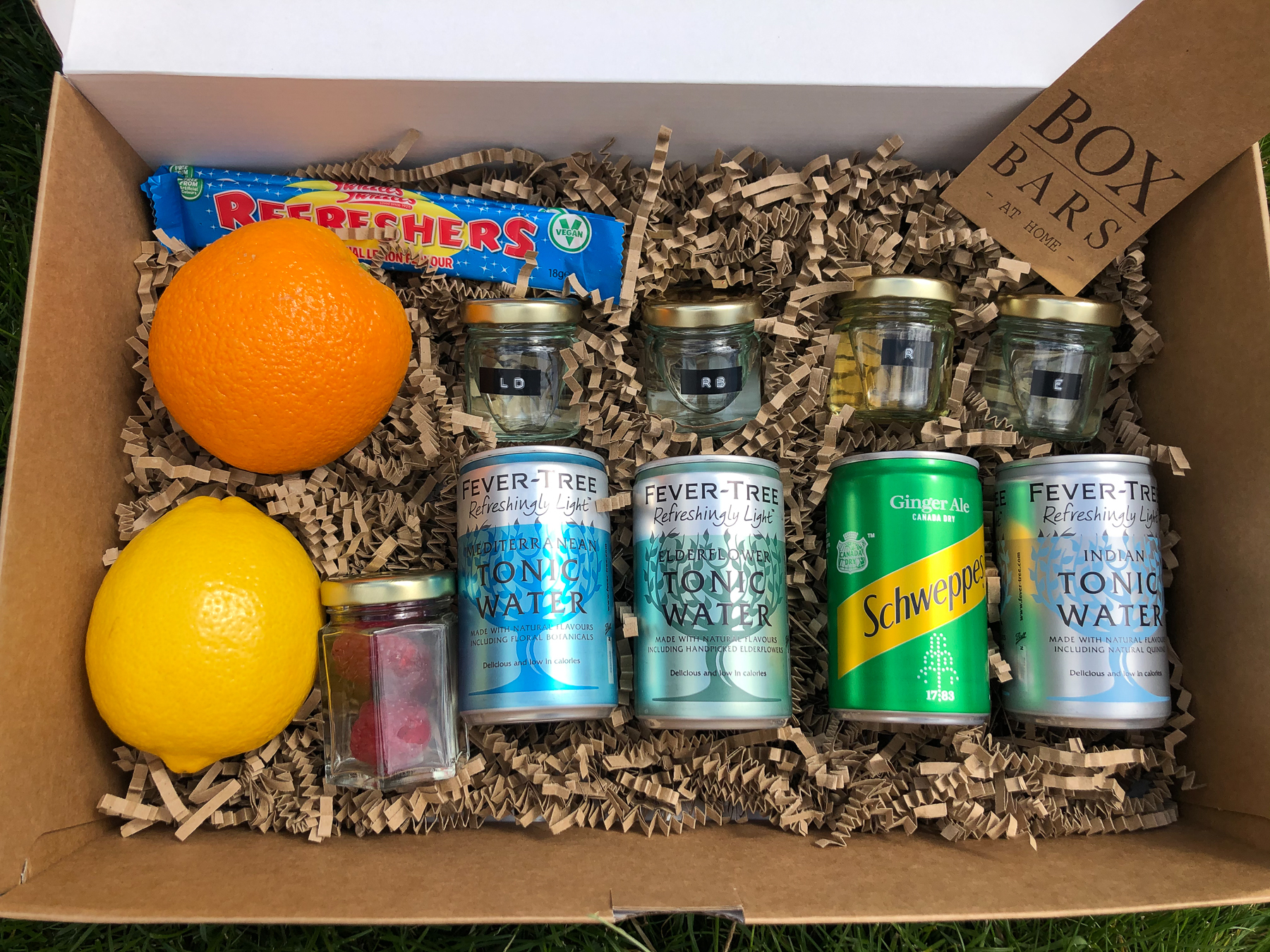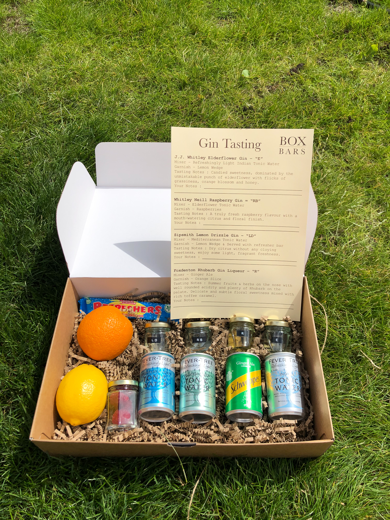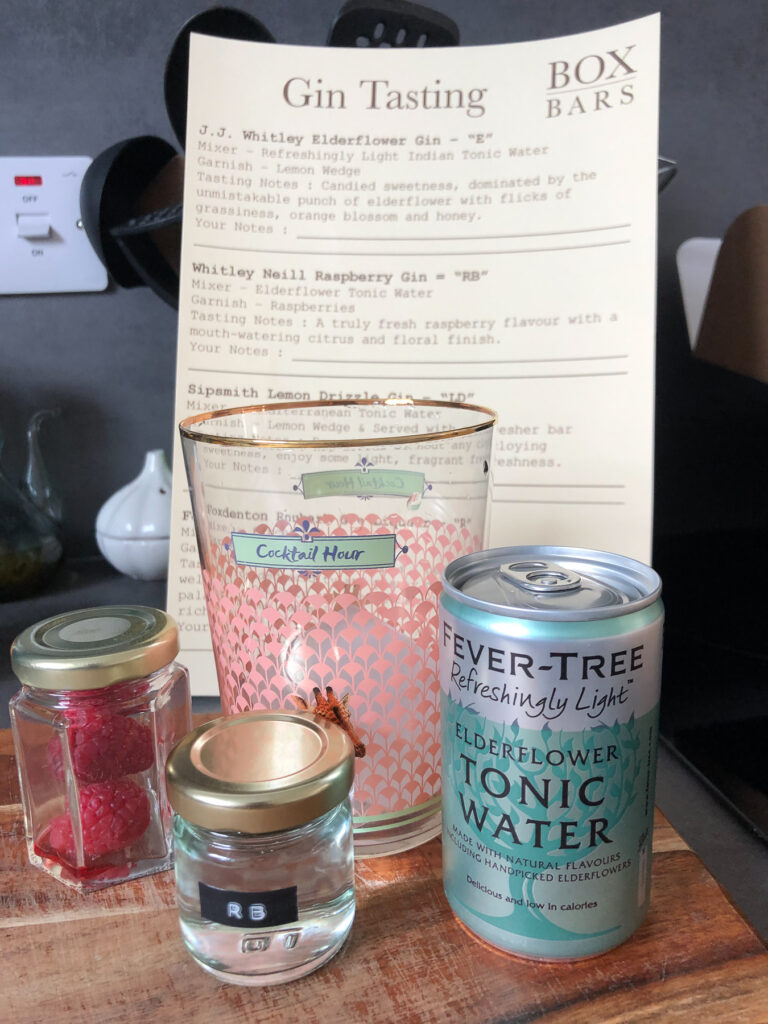 I got: Foxdenton Rhubarb; J.J Whitley Elderflower; Sipsmith Lemon Drizzle; and Whitley Neill Raspberry… Plus a little jar of raspberries, 2 refresher bars, a lemon and an orange.