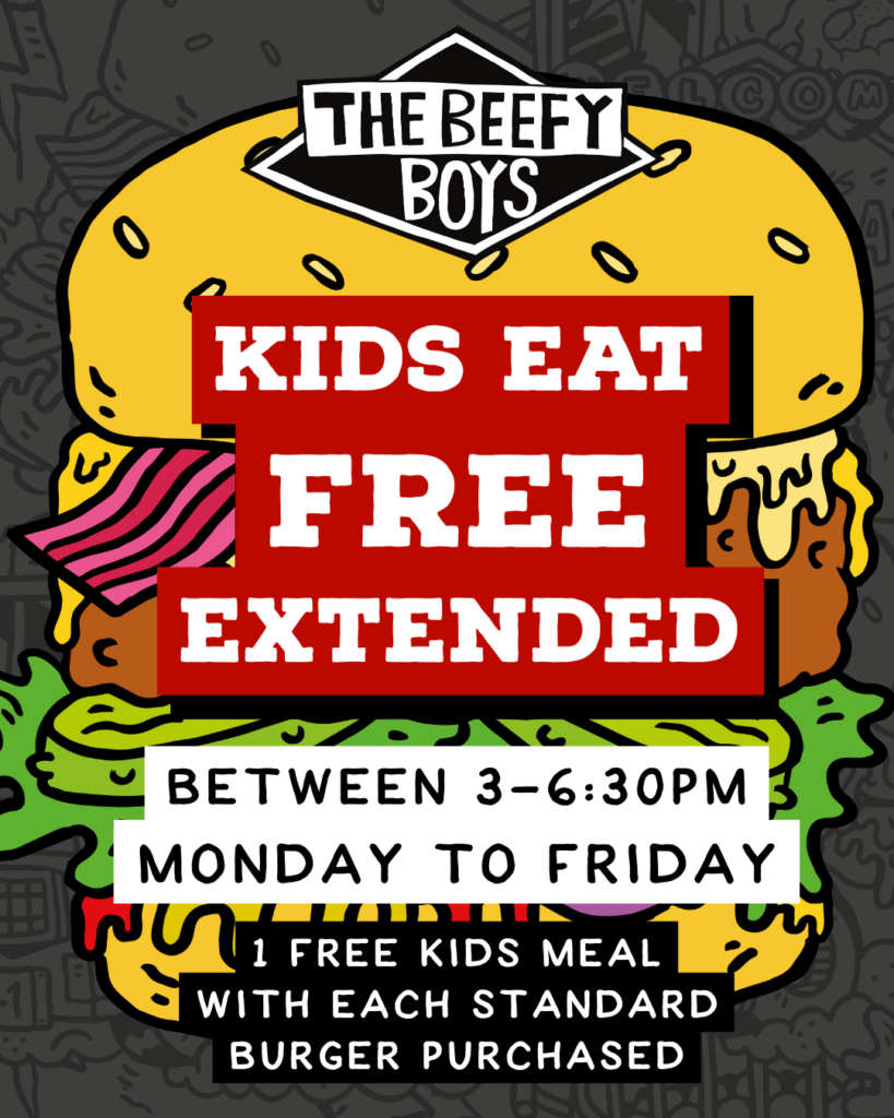 Valid Monday – Friday throughout the Easter break, 3 – 6:30pm. 1 free kid’s meal with each standard burger purchased.