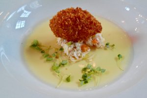 Our tasting menu began with a light chicken consommé, served with shredded chicken thigh and a delicious, dainty croqueta of roast sweetcorn, manchego and lemon balm, before moving on to a set, chilled crab bisque with crayfish tails within, and a saffron aiolo and squid ink tuille perched on top.