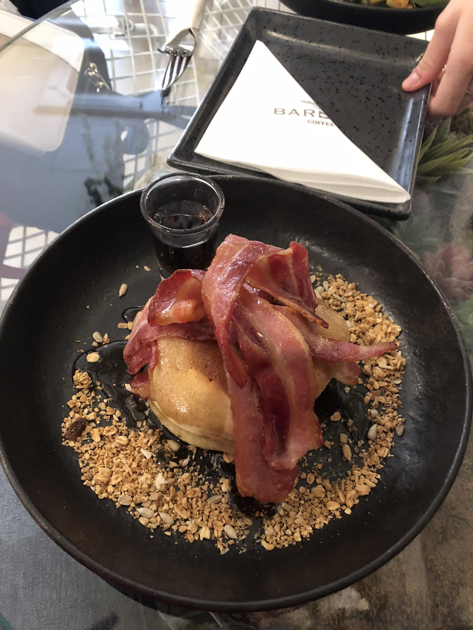 The pancakes with the ‘streaky bacon galore’ were fluffy and came with a swirl of granola and nuts, with the all-important maple syrup too. My expectations were met and unlike many other places, they weren’t stingy with the maple syrup. A big win! One thing I would say is that the bacon could have been crispier.
