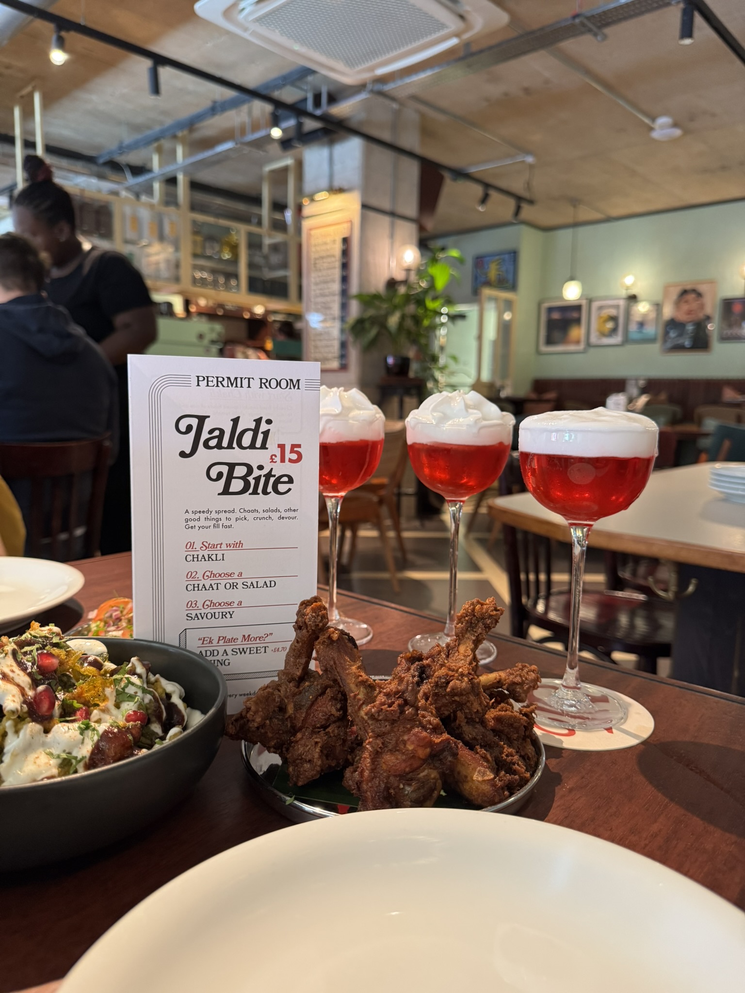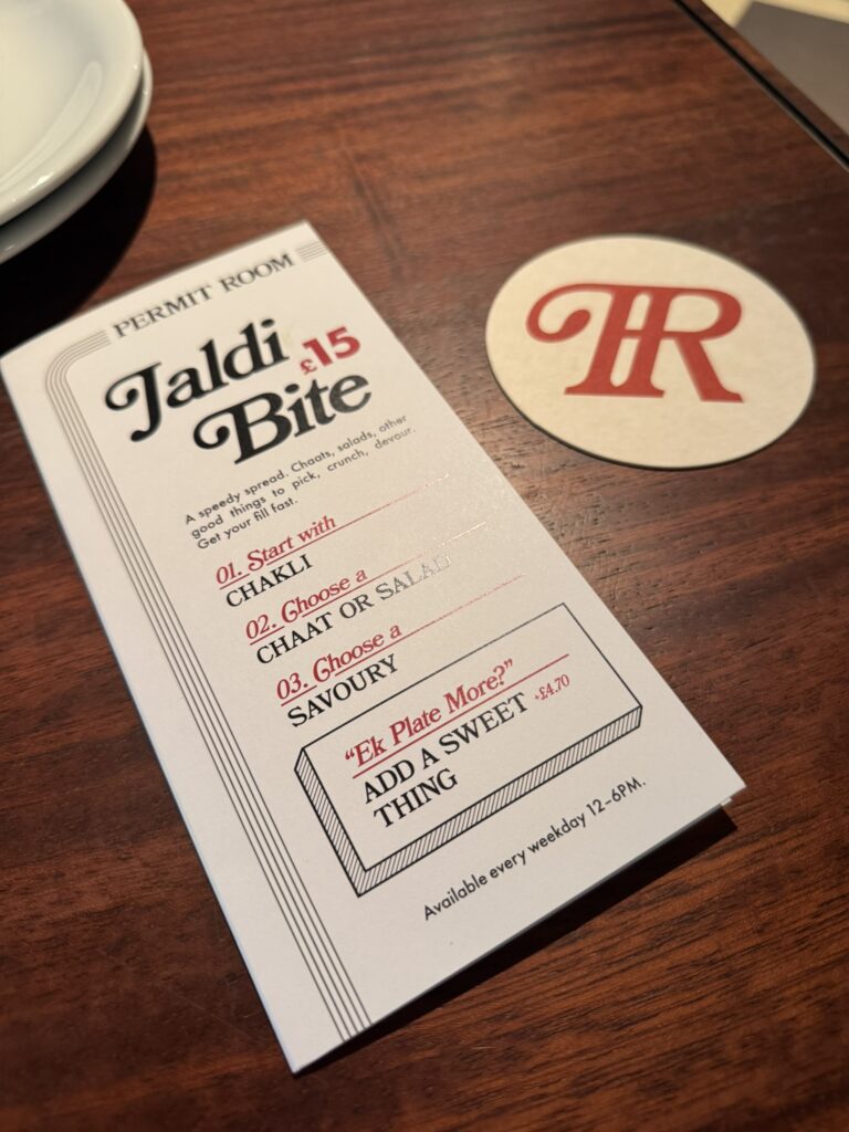 The all-day menu at Permit Room is undeniably delicious, but if you’re looking for something a little lighter – the Jaldi menu might be just the thing for you. For £15 you get some Chakli (crunchy fried snack) to start, and then you pick something from the chaat and salad section, and one thing from the savoury section. Think spinach chaat, broccoli salad, masala eggs, samosas – and more!