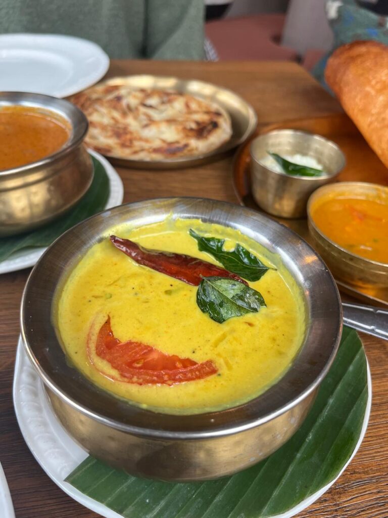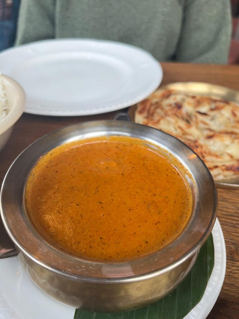 We went for the Butter Chicken (a no-brainer), Prawn Moilee, Rice, Malabar Parotta, Masala Potatoes, and the Plain Dosa.