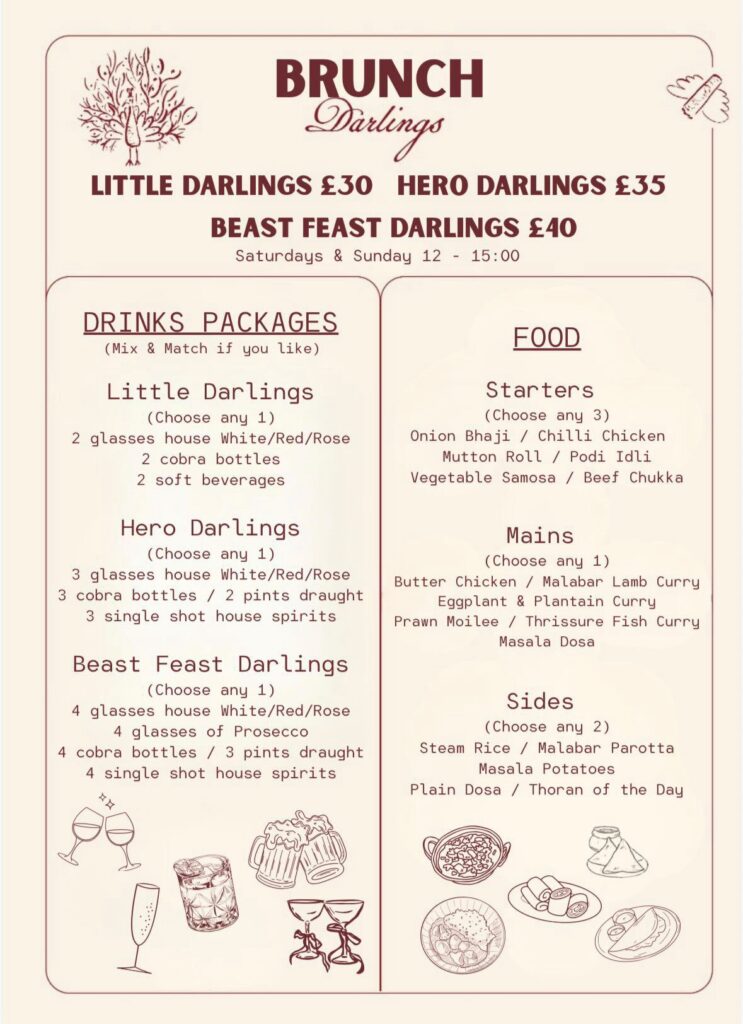 For the Bollywood Brunch, there are a few options available, and I had the ‘Little Darlings’ package, which is £30 and includes 2 drinks (there is wine, beer, and soft drinks available- see below for the full menu), 3 choices from the starters selection, 1 main, and two sides per person.