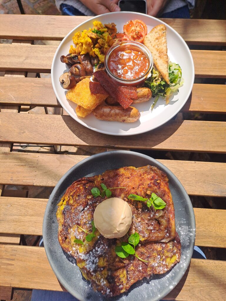 To get a taste of the different options that were on offer, we got the Fully – a vegan full English breakfast with all the trimmings, and the cinnamon focaccia french toast with caramel and coffee ice cream. The Fully arrived with roasted tomatoes, bacon, two hash browns, two sausages, scrambled ‘egg’, mushrooms, a slice of toast and a pot of gourmet baked beans. Though I am Scottish and I will always be partial to a tattie scone with my cooked breakfast, I must admit I love a good hash brown and these from the Oxford Blue were great, crispy, salty and fluffy inside.