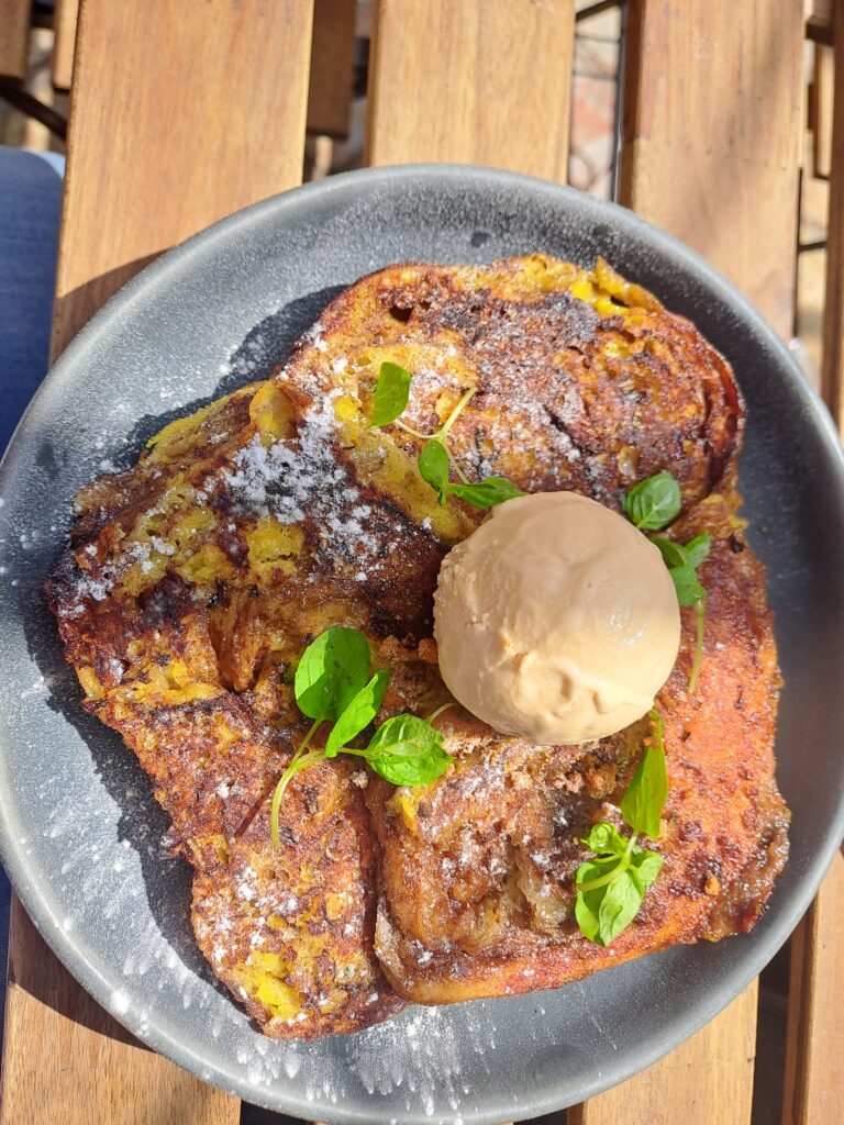 One of these options was the cinnamon french toast. I love cinnamon, french toast and coffee so this dish seemed almost created for me and it did not disappoint. You get served three large slices of swirly, sweet cinnamon-y focaccia french toast with a smooth coffee ice cream. I loved how the cinnamon was incorporated into the focaccia bread itself and not just as an add-on. It meant that you got the full depth of flavour in every bite. It was almost akin to a cinnamon roll (one of my favourite pastries). And you got bang for your buck on this dish, I struggled to finish it and it was under £10, a rarity these days in Oxford.