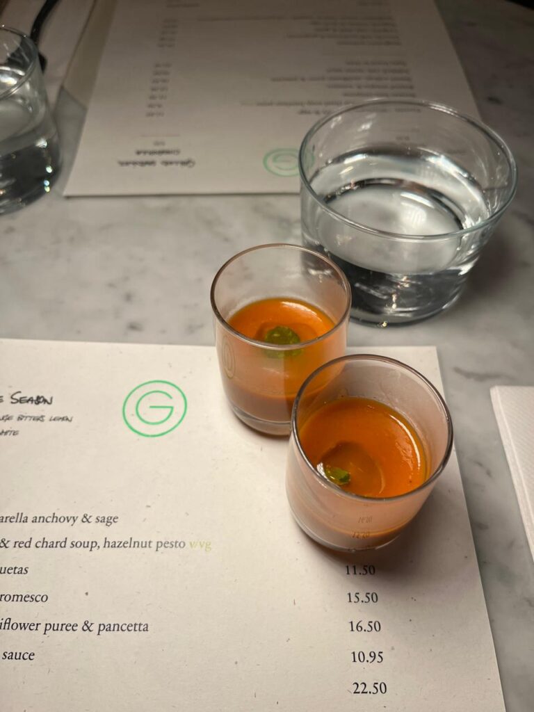 To warm us up, we were served two shots of tomato and basil soup. This was the perfect way to warm us up and wake up our palates.
