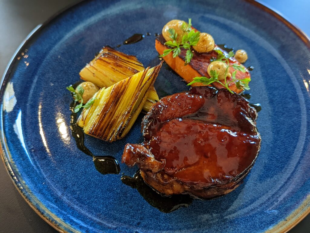 Rachel went on the waiter’s recommendation again for main, selecting the 48 Hour Braised Pork Collar, Charred Leeks, Sweet Potato Fondant, Leek Emulsion, Beer Glaze (£26).