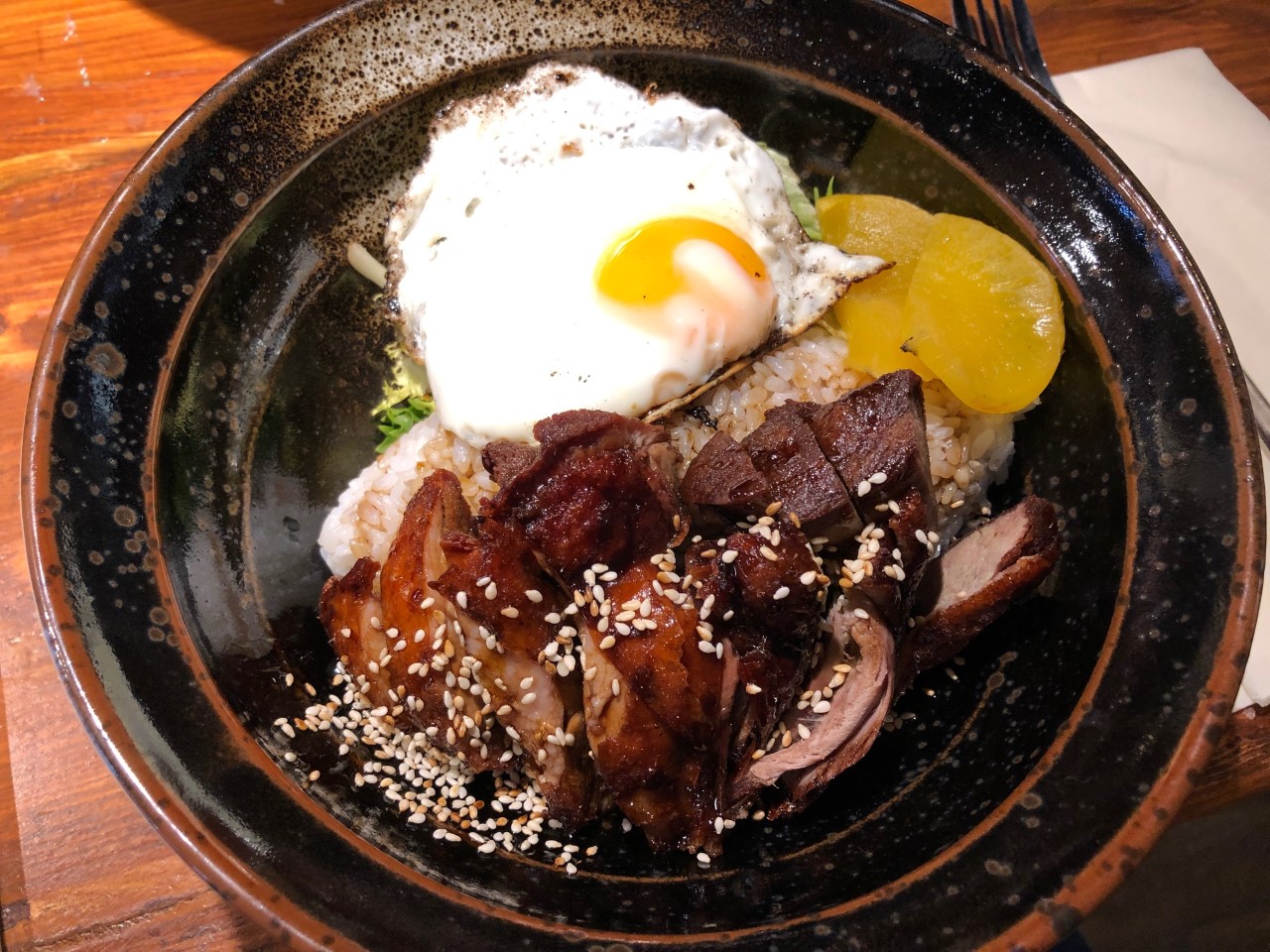 I also tried the Duck Teriyaki Donburi (£11.50). What’s not to like about crispy roast duck in sweet teriyaki sauce topped with sesame? If you have a liking for meat + sweet, with an emphasis on the sweet, this is a dish for you. It was served simply over sticky white rice with a fried egg on the side. Getting a bite of the three elements together was a fine combination of sauce-lacquered meat, starch, and rich yolk. A bowl of salty edamame beans (£3.00) on the side was the perfect foil.