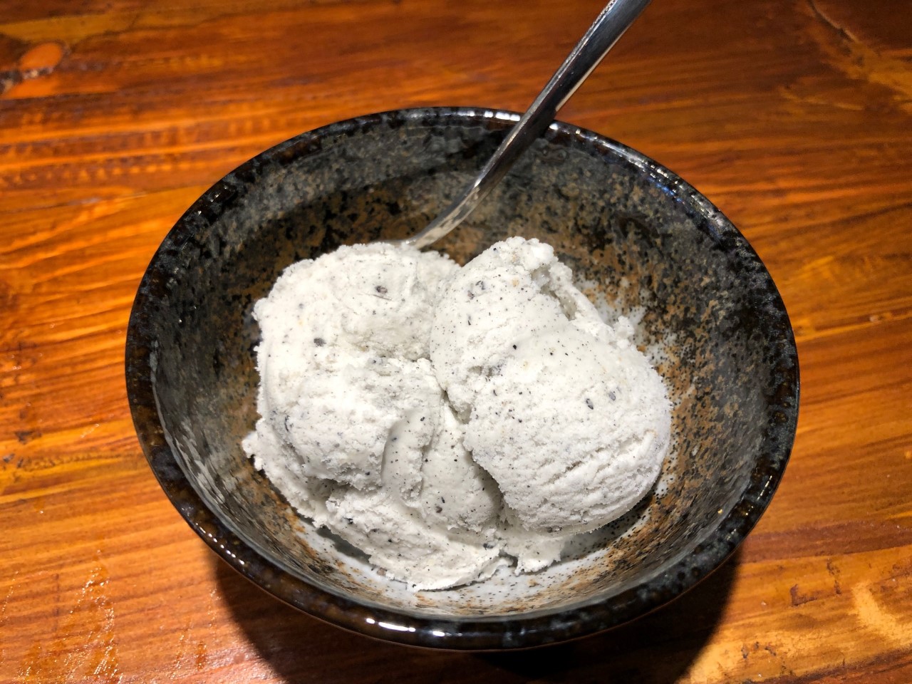 The final choice was Takoyaki Balls (£4.50), deep-fried octopus balls that are a popular street food originally from Osaka. The smooth interior had a seafood-ish rather than a particularly octopus quality and even the crispy exterior couldn’t rescue these snacks from being just a bit bland. They were the weak link in my lunch, but luckily dessert was a step back in the right direction. Instead of the mochi, I went for a bowl of black sesame ice cream (£3.00). It looked like cookies ‘n’ cream but actually had a lovely nutty sesame flavour that lingered pleasantly on my tongue.