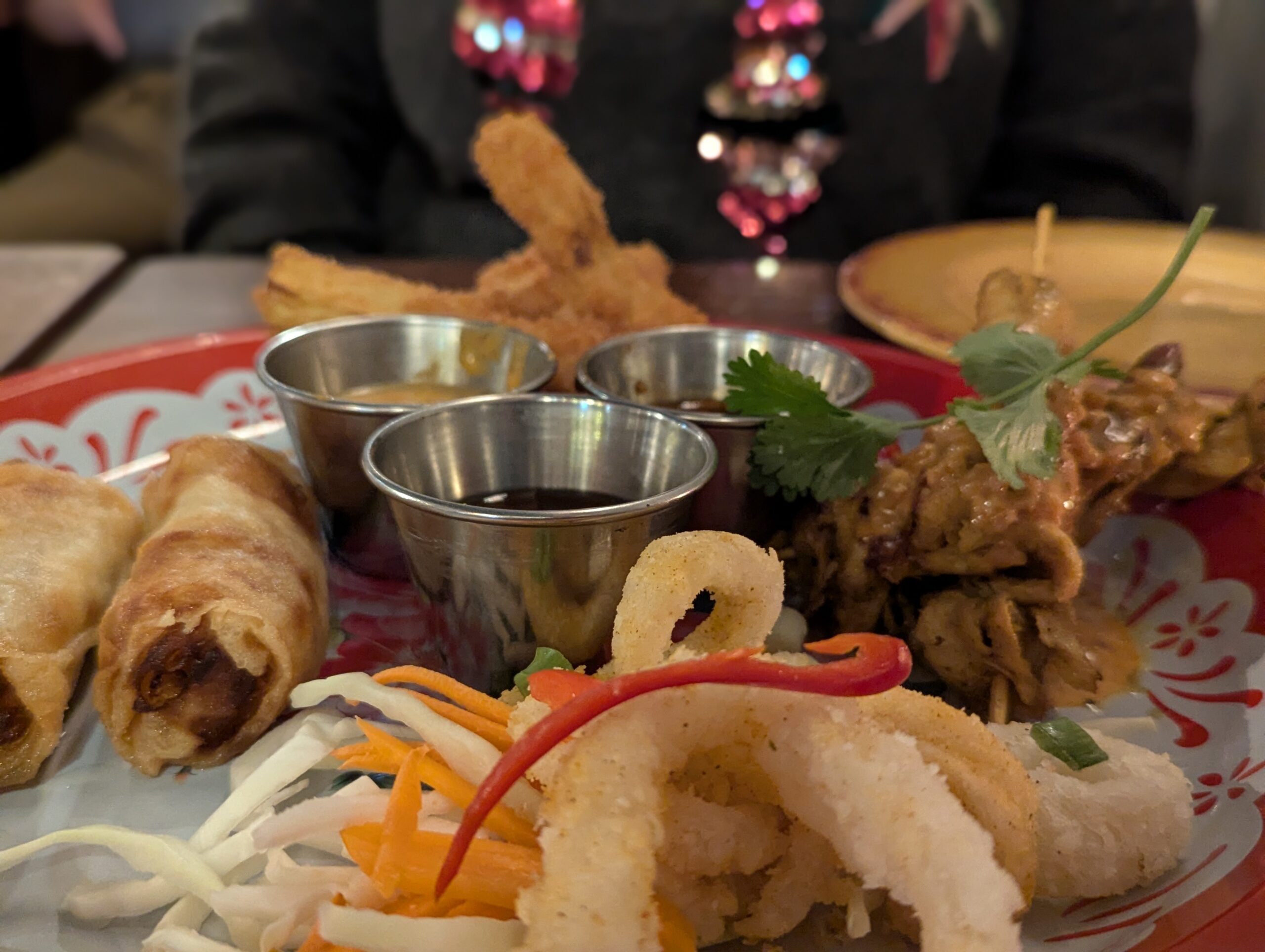 You kick things off with their banging, irresistible prawn crackers, a generous bowl per person. You then choose a sharing platter, and we went for the Classic. This included crispy pad cha aubergine, veggie spring rolls, chicken satay and Thai calamari. It’s presented beautifully on a round platter and everything was delicious.