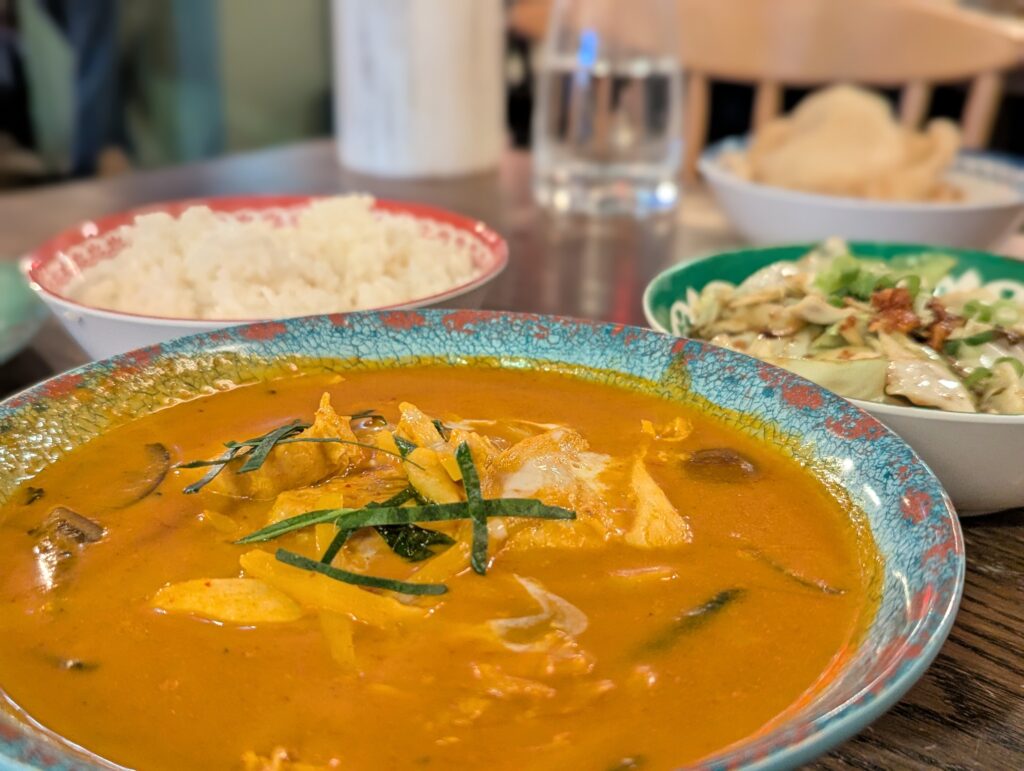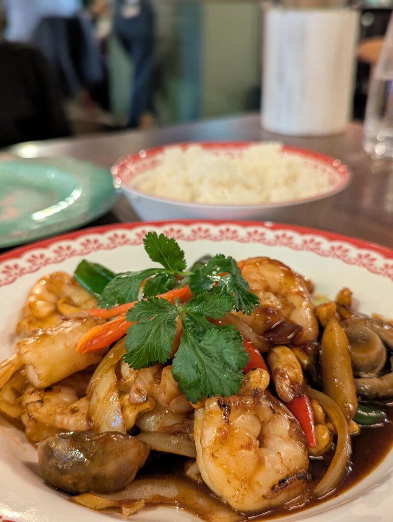 For mains, we chose the chicken red curry with jasmine rice, and the cashew stir-fry with jasmine rice and king prawns. The red curry was rich in flavour, while the cashew stir-fry was delicious and more mellow in spice. The mushrooms were particularly good! We also ordered a side of Thai cabbage for £5.50, which was a really tasty addition.