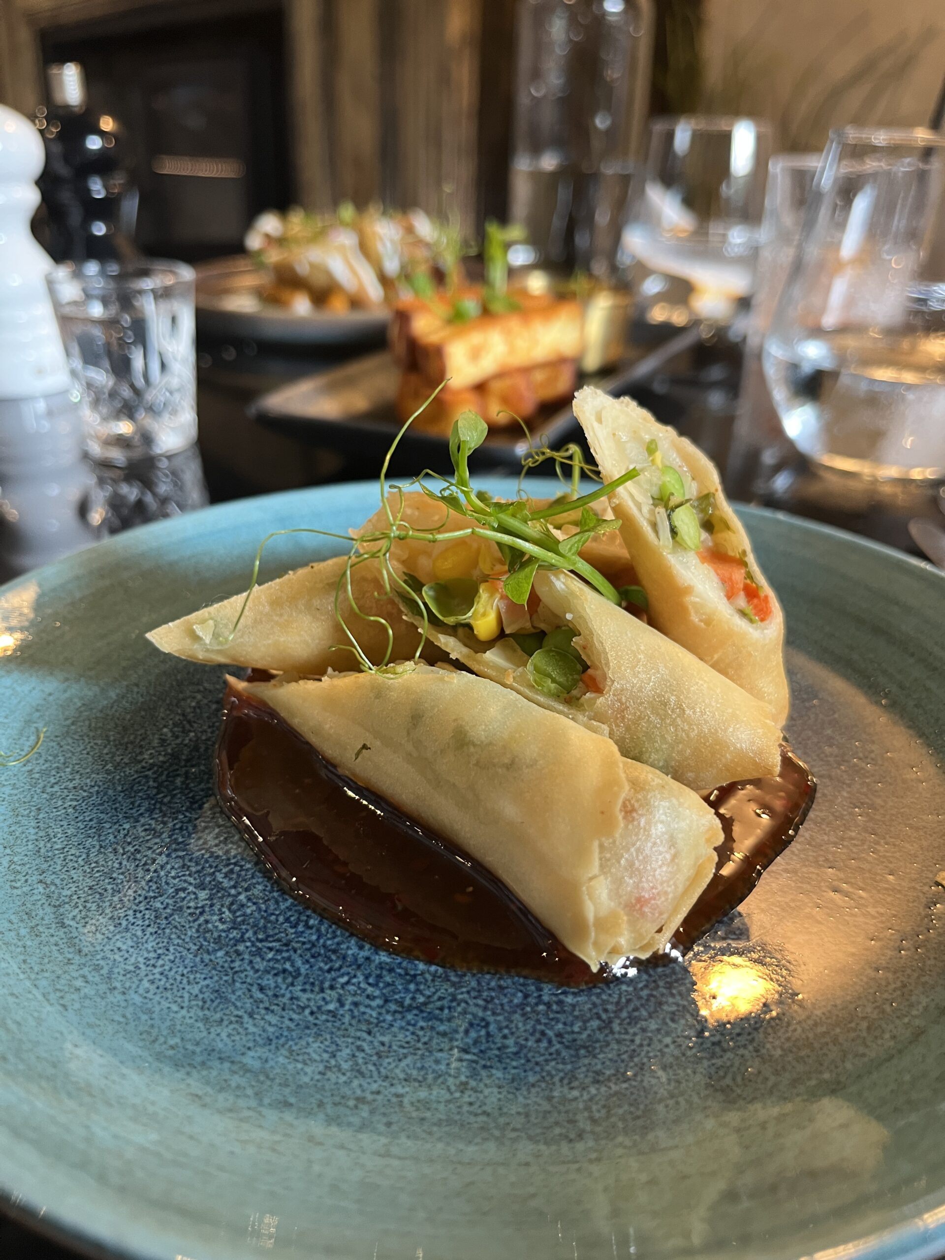 We started with masala paneer bites, samosa chaat, and vegetable spring rolls.