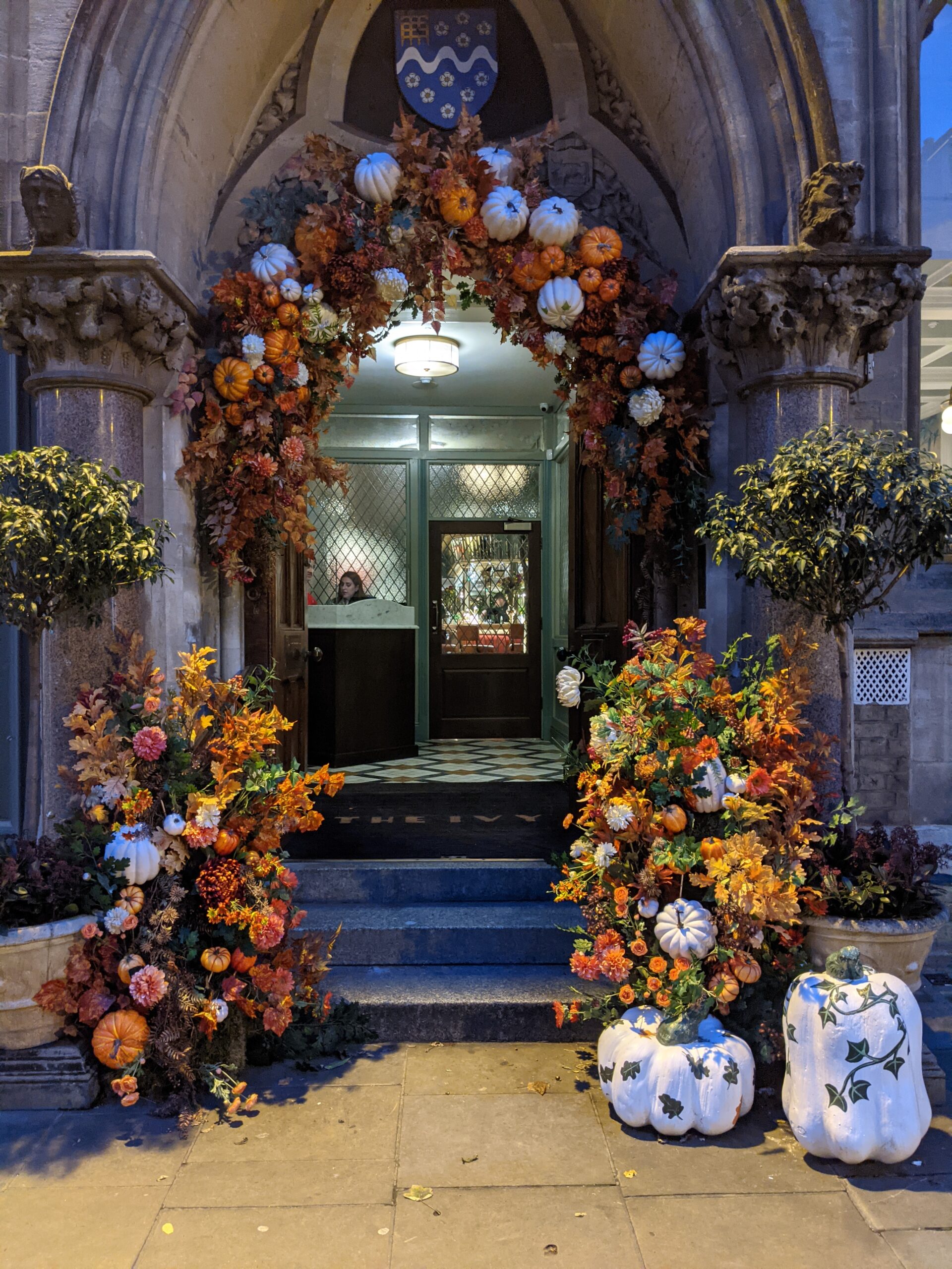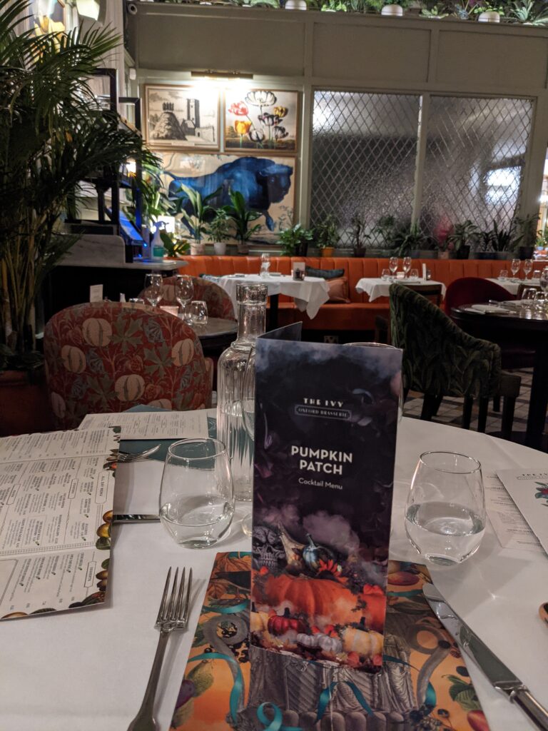 The Ivy Oxford Brasserie invited me along to try out their limited edition Halloween cocktails (more about those later). The Ivy sits on the High Street in central Oxford in an extremely grand and vibrant building. The entrance of the Ivy is always seasonally and beautifully decorated. At the moment it’s adorned with autumnal flowers, leaves and painted pumpkins – gorgeous.