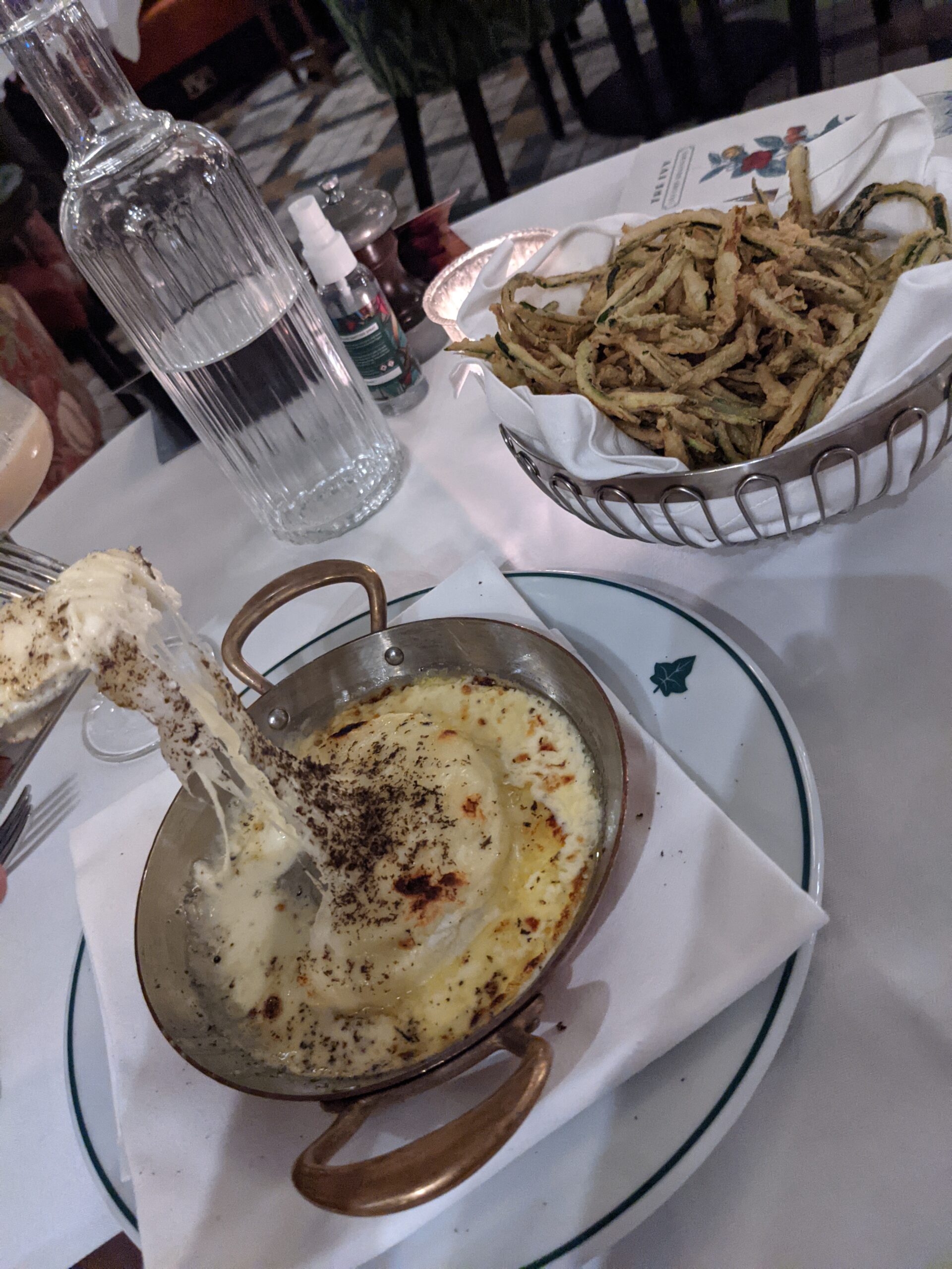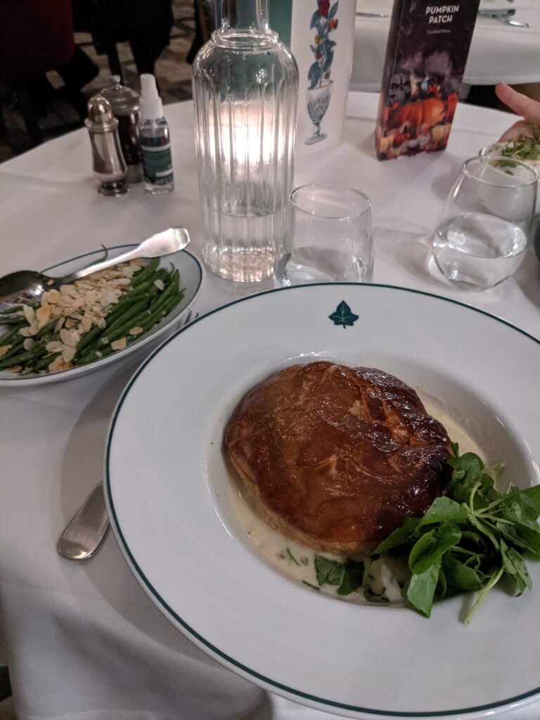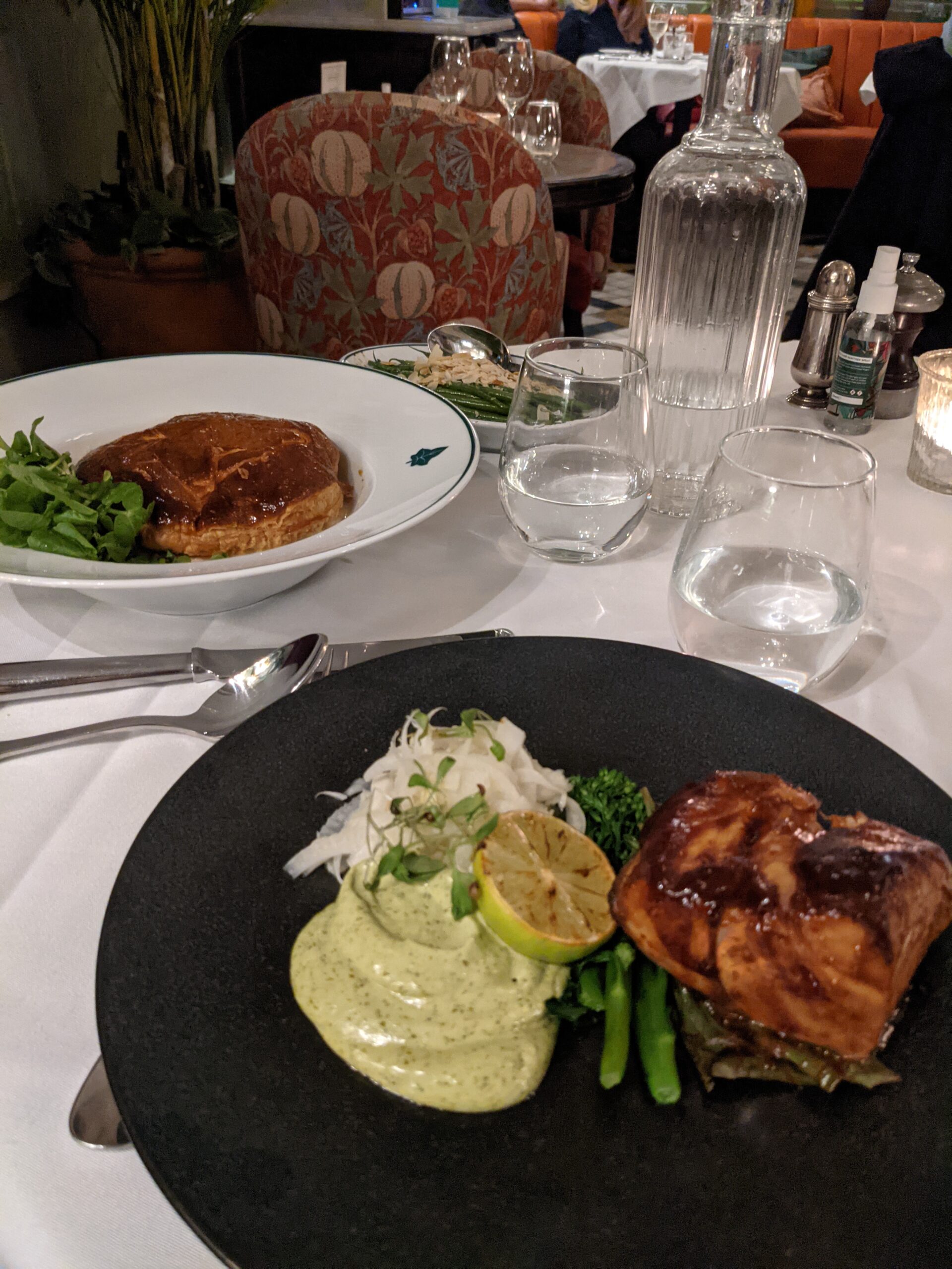 We were pre-Mothers’ Day guests of our daughter who lead us to expect great things of the Ivy. I was disillusioned. Our aperitifs arrived after the starters after some plaintive exchanges with our waitress. The rabbit pie tasted great, but served in a dish under a brown beret of a pie crust made it a challenge to eat daintily, and the chocolate bombe disintegrated under its hot chocolate sauce, which made such a mess of whatever the white foam surrounding it was meant to be.