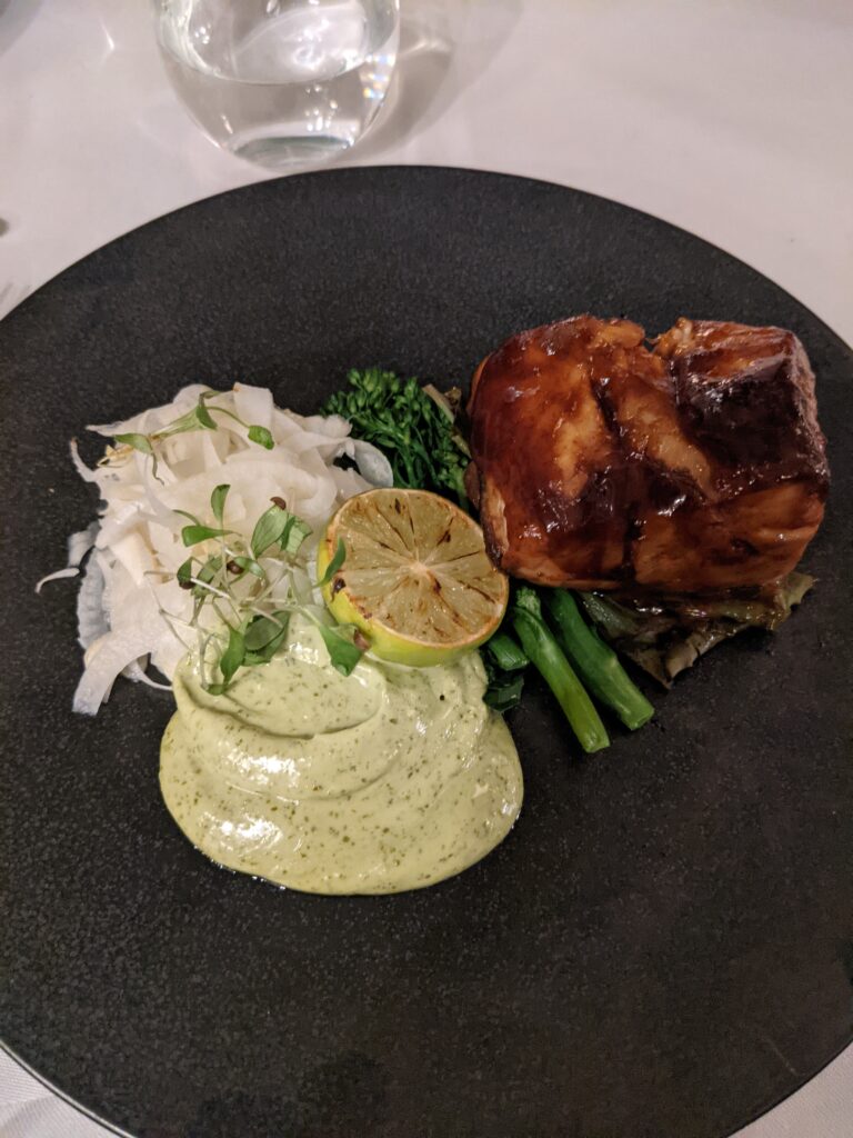 For mains, I ordered the blackened cod fillet (£17.95) and my partner ordered the rabbit and langoustine pie (£17.50). The blackened cod was served with a soy marinade, citrus-pickled fennel, grilled broccoli and a yuzu mayonnaise. It was light (which was what I was going for as I wanted to squeeze in a dessert too) and the flavours worked really well together. The fish fell apart and was soft and fluffy. The tangy soy marinade really succeeded at bringing the dish to life.