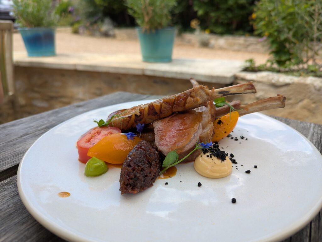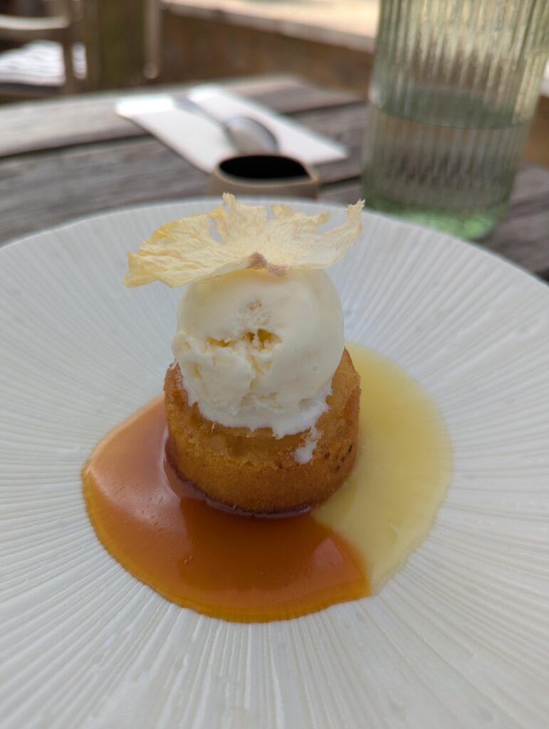 The lamb rack was a standout main. Cooked to a perfect pink, the meat was tender, juicy, and full of flavour. It was paired with sweet Isle of Wight tomatoes, smoky grilled courgettes, and an unforgettable bacon jam – rich, sticky, and packed with tiny shards of intensely crisp, savoury bacon that delivered a deep punch of flavour with every bite.