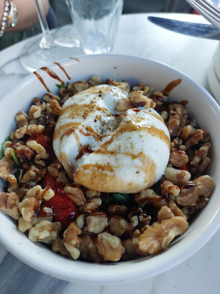 Alongside this was a garden salad with added burrata, walnut and olives (£7.95 for the base salad, toppings an extra £2.95). This was another large bowl, and a very tasty mix of salad leaves with roasted pepper and rocket. The toppings were generous and the burrata melted in beautifully. It went perfectly with the chorizo but equally worked very well on its own.