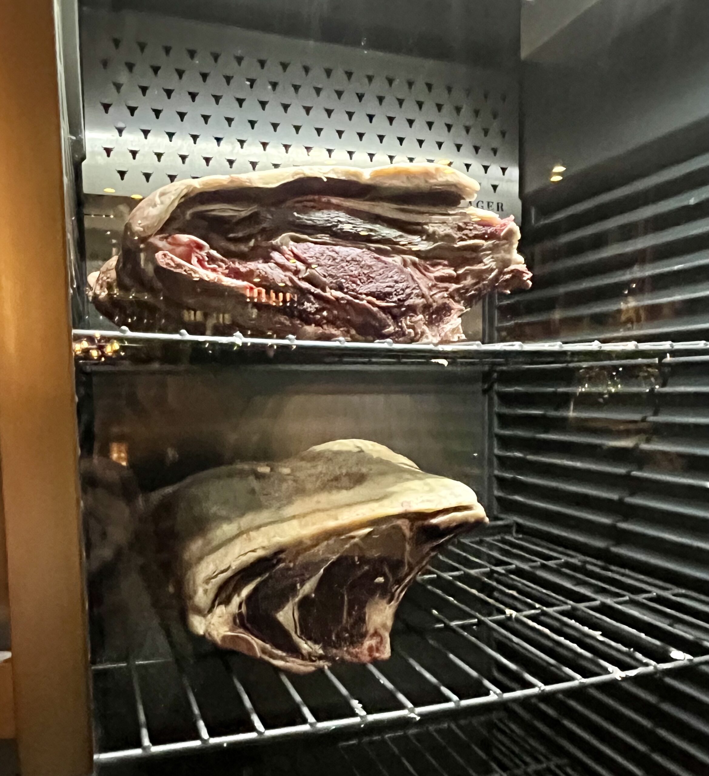 Step through the door, and you’ll find a charming, understated décor. The vibe is very much gentleman’s club. Think polished copper and wooden tables, cream leather banquettes, and dark walls painted in a colour straight out of the Farrow & Ball catalogue. There’s a glossy, well stocked bar, and a blackboard featuring the cuts of meat on offer. The restaurant sources these from Smithfield market and then dry ages them for up to six weeks to enhance the flavour and texture. Wander to the back of the restaurant, and you can see the meat in the glass-fronted fridge – presumably on display to both establish their ‘steak-cred’ and whet your appetite: it certainly worked for me.