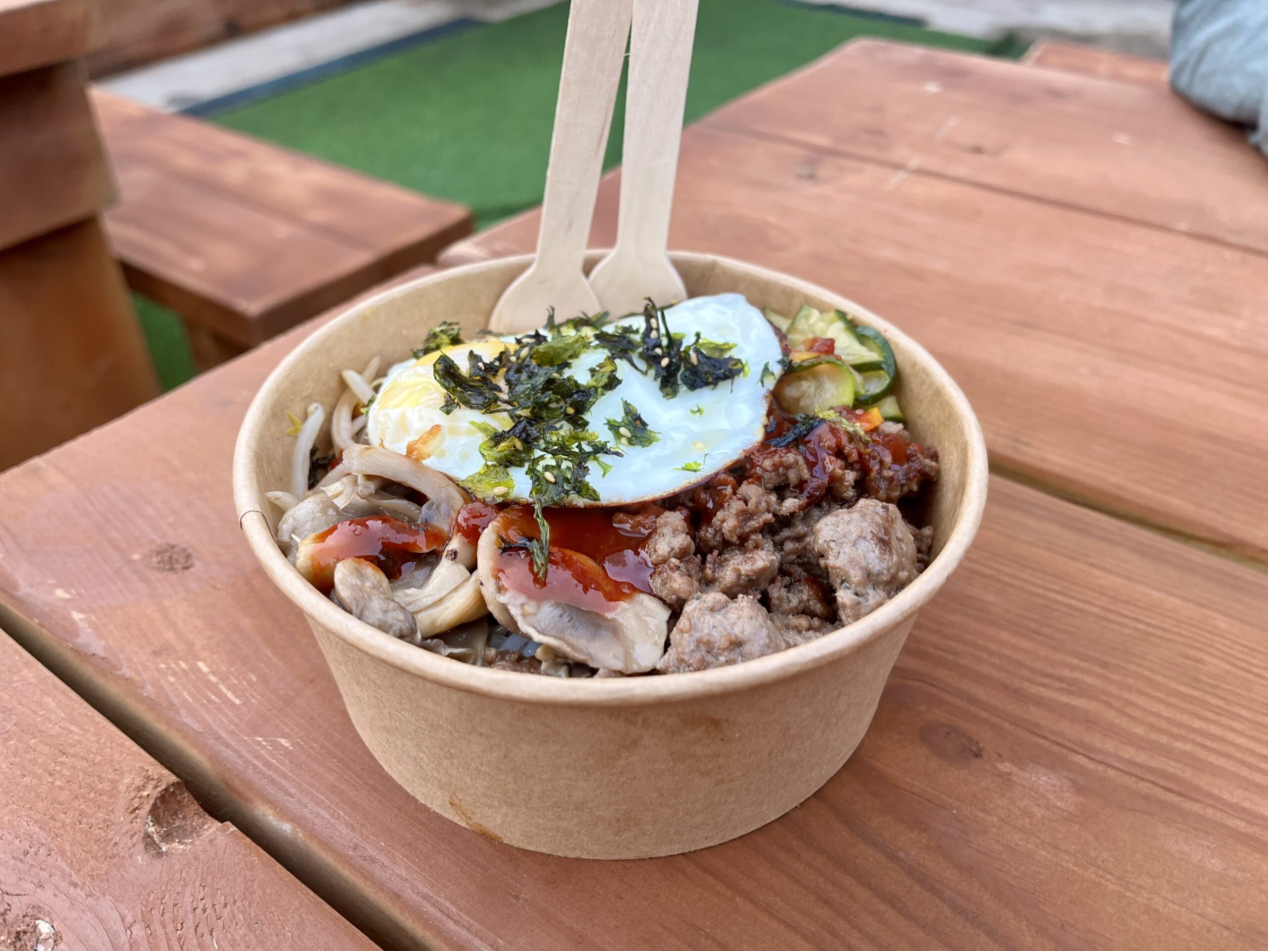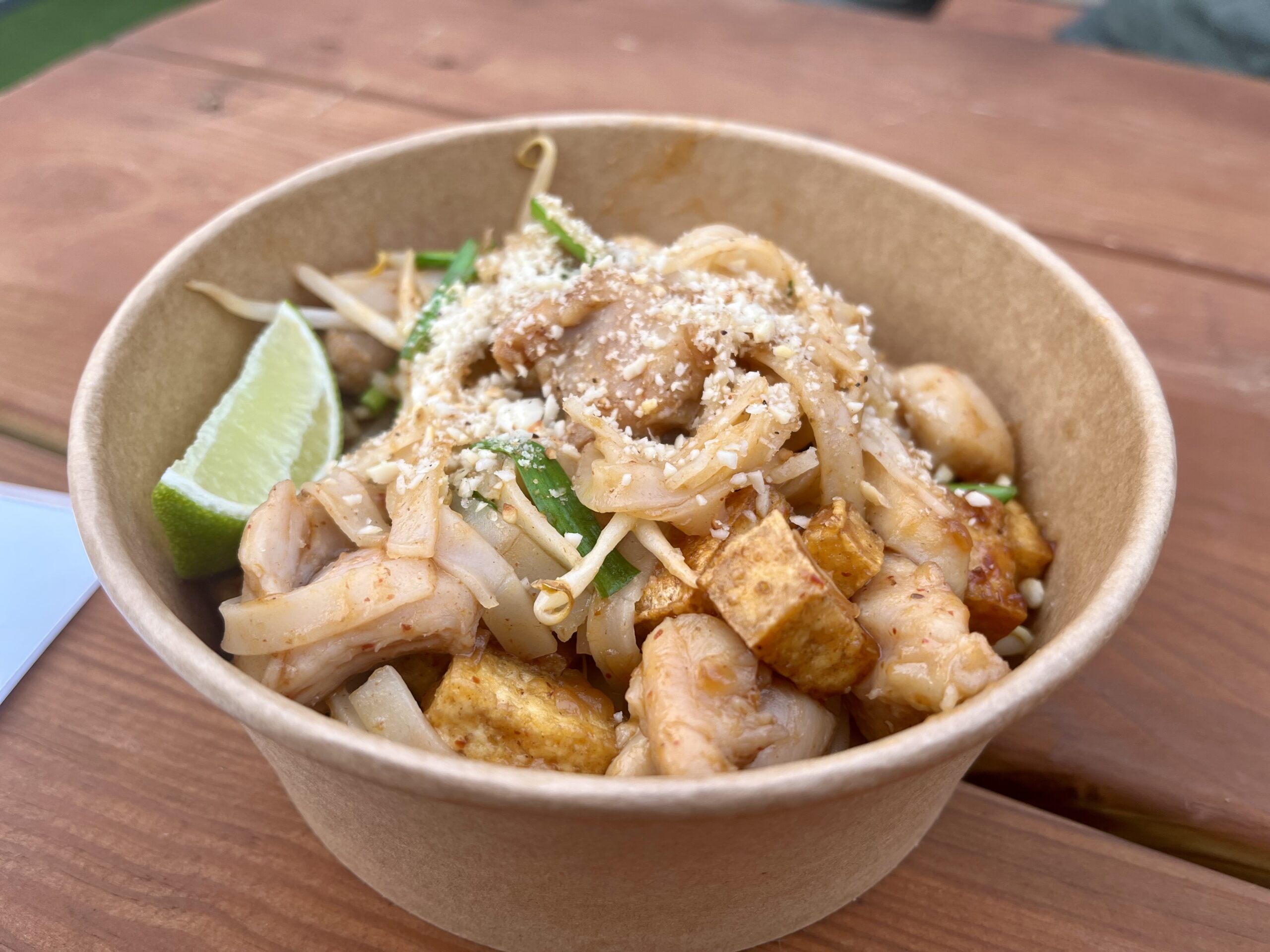We took a walk around the different food stalls, though you can do your browsing online if you prefer. I lingered a while over the Casa di Birria taco menu but finally got a beef bibimbap from Seoul Food. In no time, I had a hearty bowl filled with rice and topped with soy beef, kimchi, a fried egg and some crispy carrot. It was tasty and satisfying, though I wanted more hot sauce to dial it up a few notches. From Sawadee, we got a Pad Thai chicken bowl with stir-fried noodles, tofu and prawns. The noodles had a great texture, while the tangy tamarind sauce was a bit too sparing to have real tang.