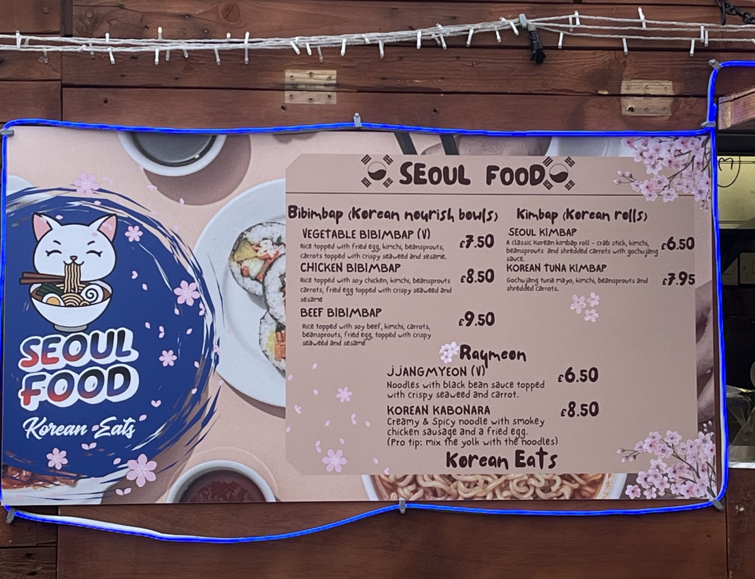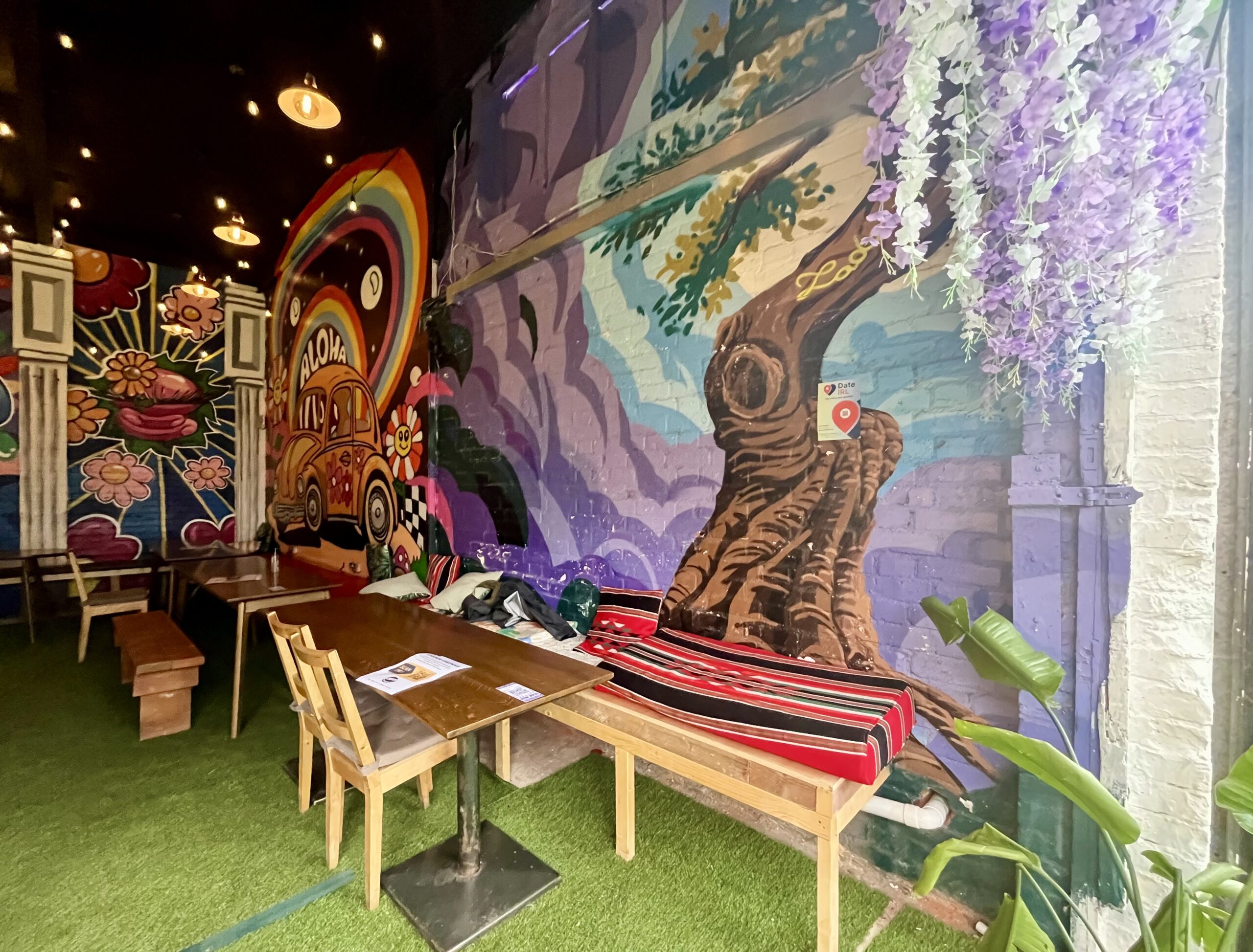 The colourful outdoor space is simple in a picnic-table-on-astroturf way, and I found it very inviting for a casual meal. There’s an indoor hang-out area with games tables to encourage you to linger for a while. When I visited, there was a lively crowd; many of them weren’t even eating because they were having too much fun playing drinking games.