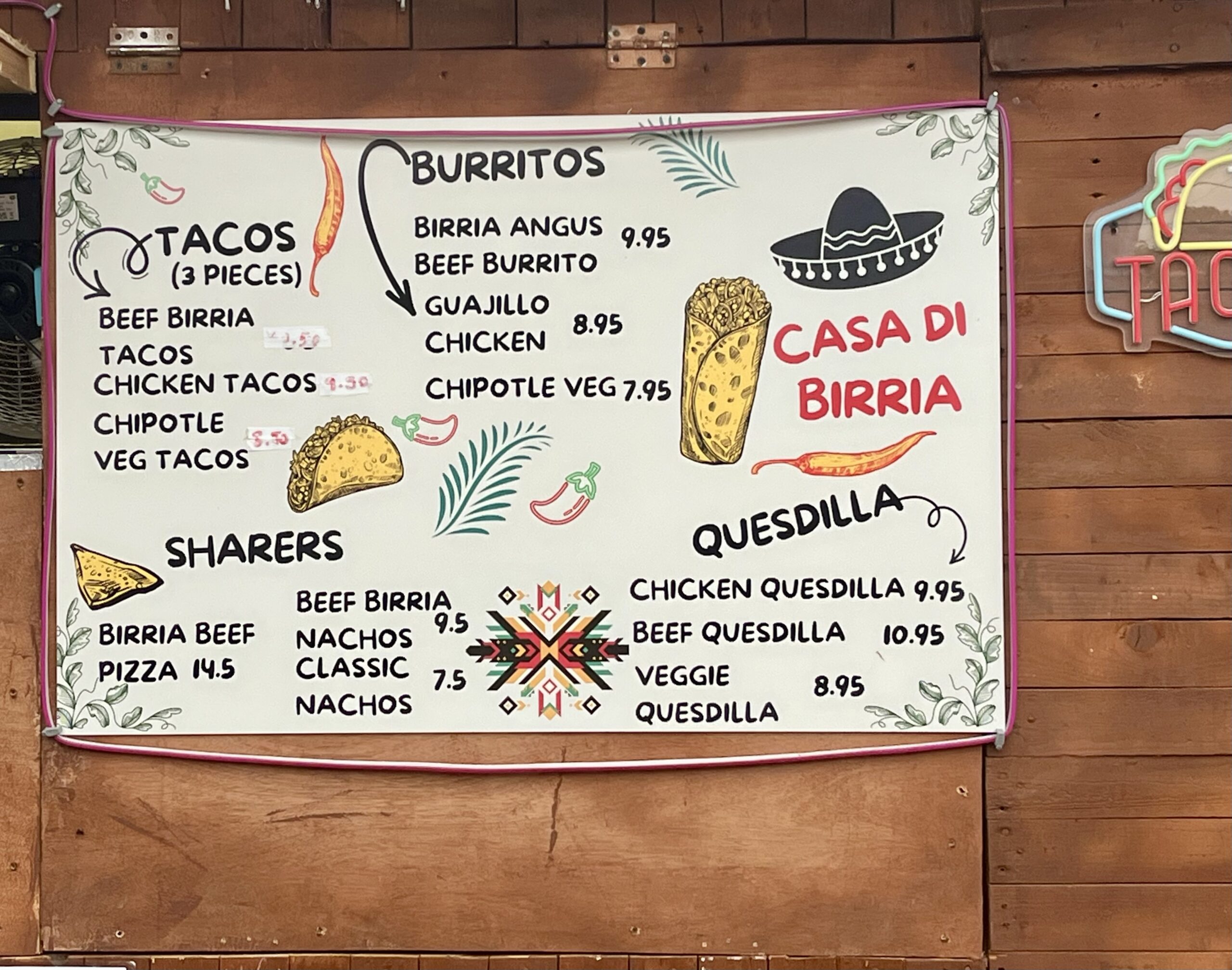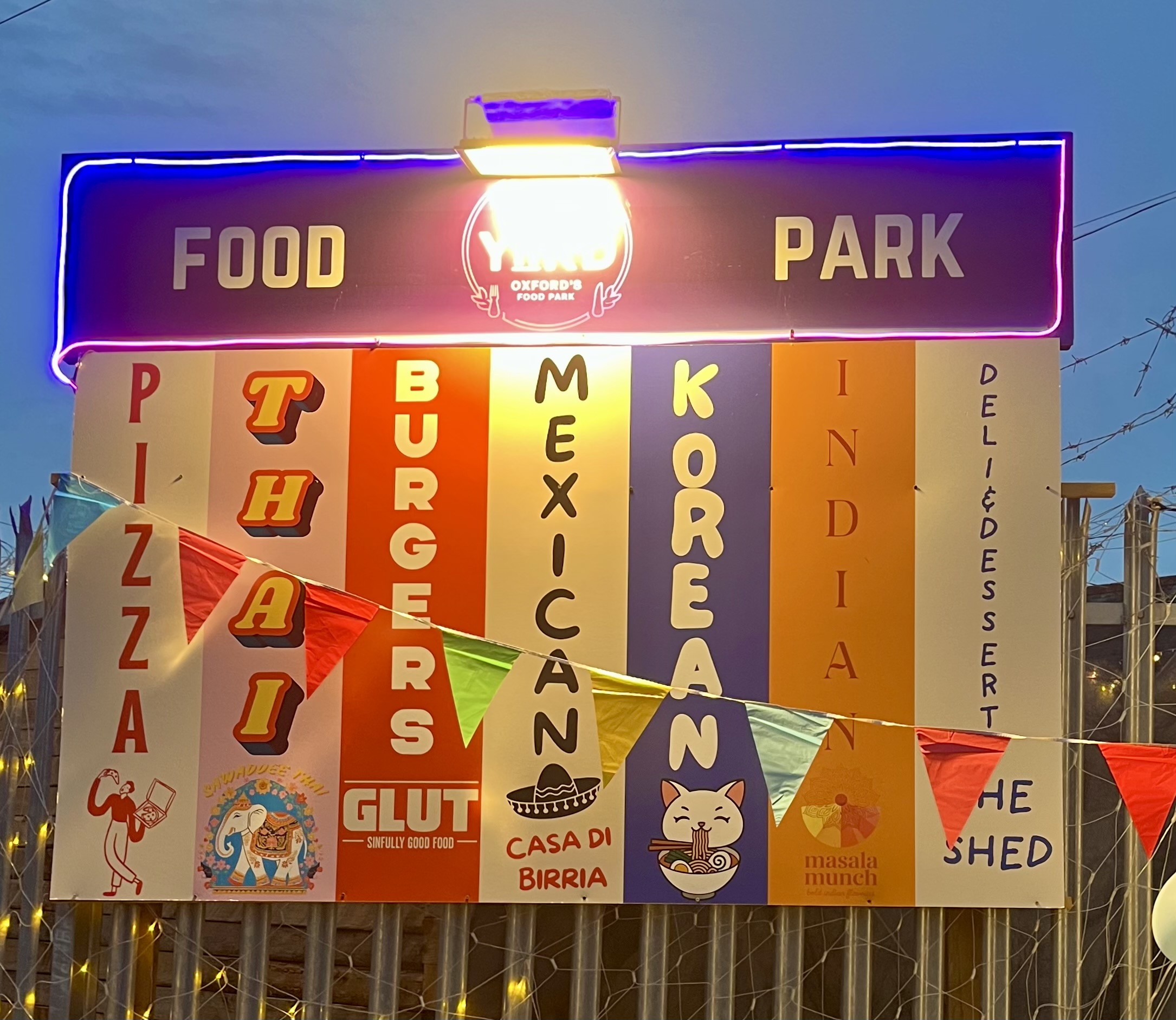 The Yard is an open-air food court and community space featuring seven different independent street food vendors including Masala Munch, Glut, Casa di Birria, and Viva la Pizza.
