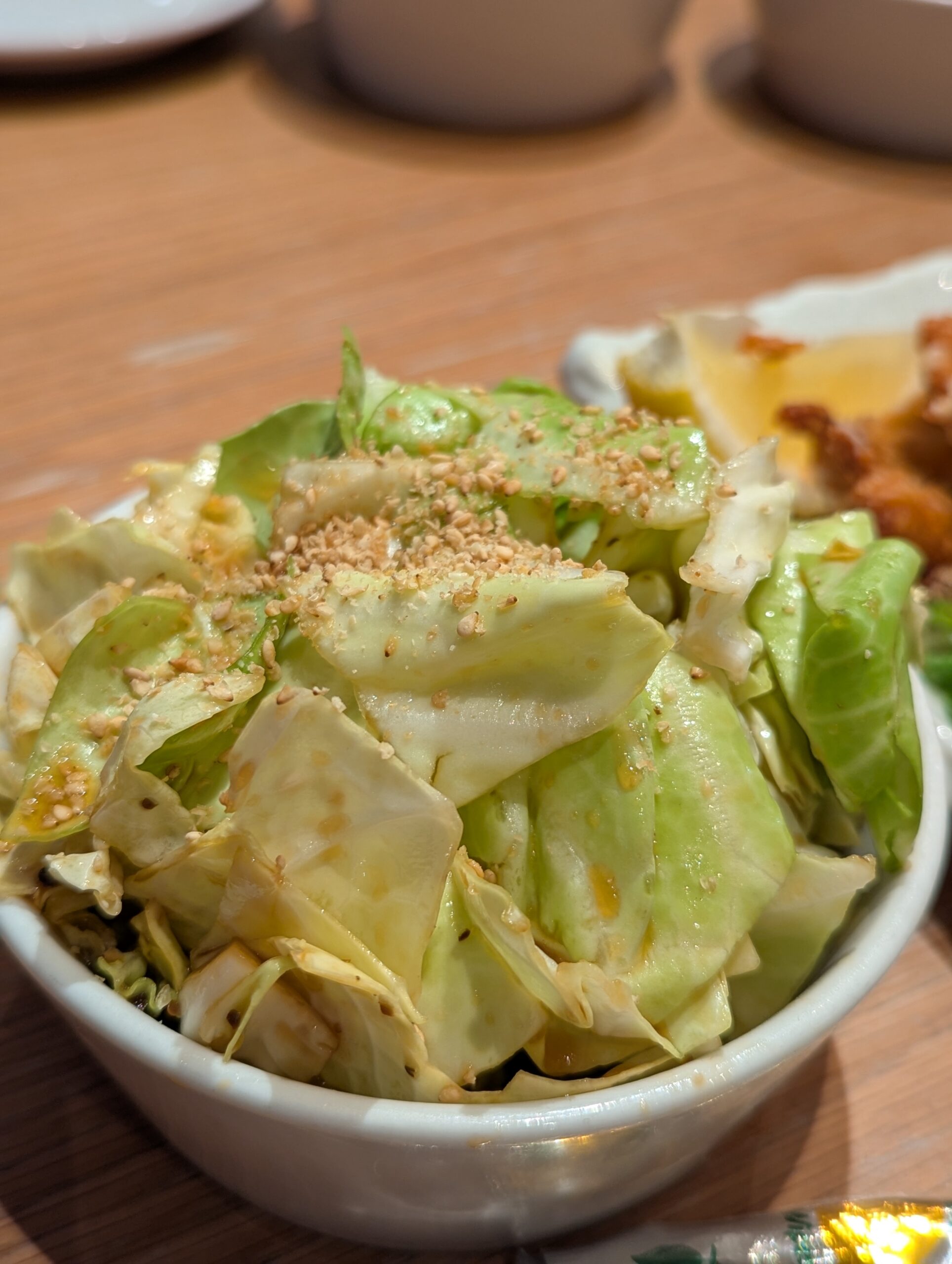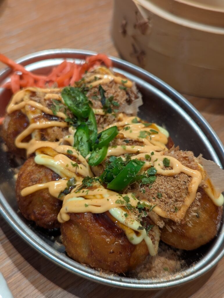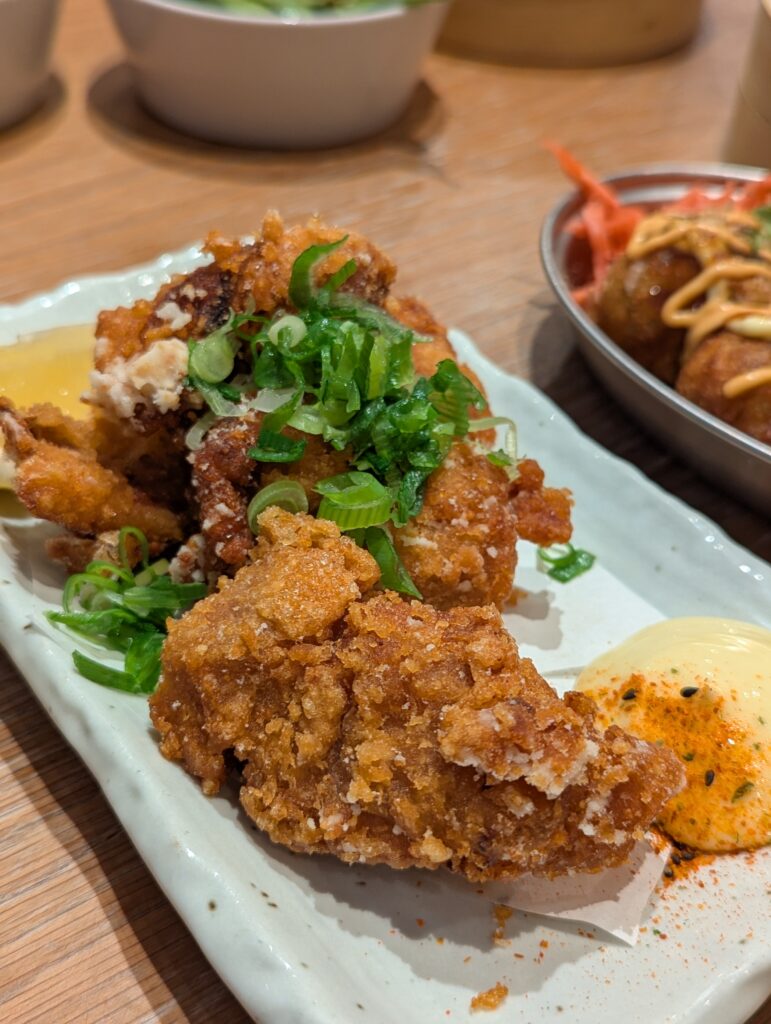 We started with a few small plates. The Hakata Tetsunabe Gyoza (£8.95) were a highlight, crisp-edged, juicy, and packed with flavour. The Chicken Karaage (£10.50) was another favourite, golden and crunchy but not greasy, especially when paired with the Yamitsuki Cabbage (£3.90), which added a refreshing balance. The Spicy Takoyaki (£8.50) offered great textures, though we’d have liked a stronger hit of octopus and spice.