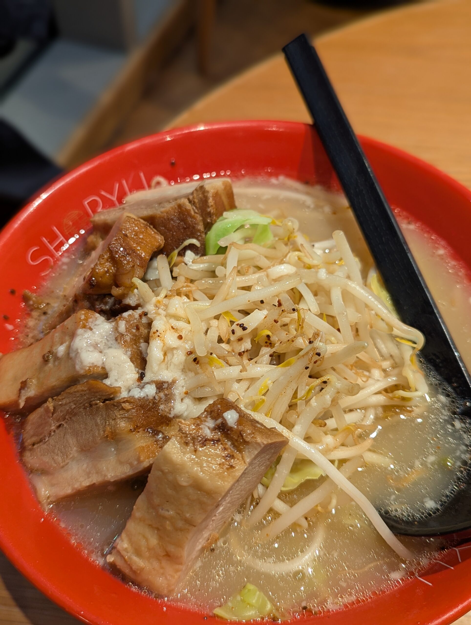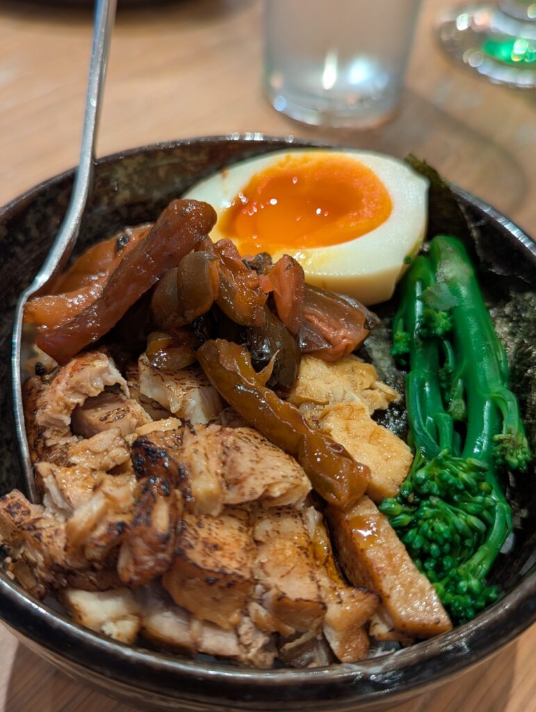 We were invited to try their new special, Jiro Ramen (£23.00), a dish that’s less of a meal and more of a cult experience. Jiro Ramen isn’t subtle. It’s huge, unapologetically garlicky, and almost theatrical in its excess. Think: eight-hour kakuni pork belly, thick futomen noodles, a mountain of bean sprouts, extra seabura back fat, and heaps of minced garlic.