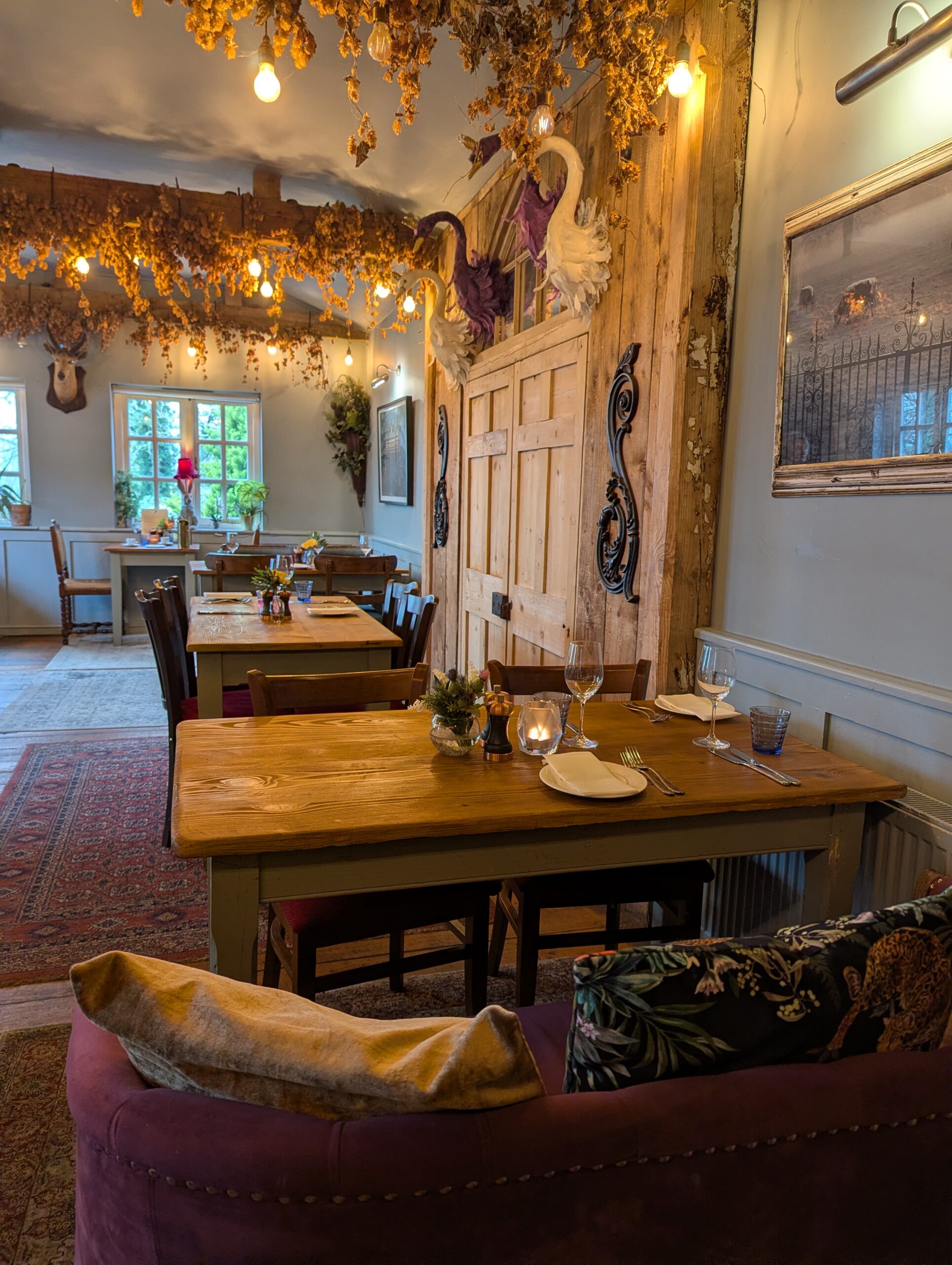 This is everything you want from a Sunday country pub. Think open fire, candlelit tables, rustic beams and a stone-built setting, paired with lovely, interesting furniture that adds charm, character and individuality.