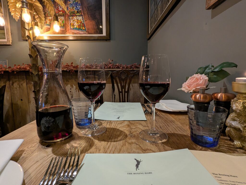 We were seated next to what can only be described as a gold pineapple tree light, which somehow worked perfectly. The Boxing Hare’s menu revolves around seasonal, locally sourced produce from British farmers, and that focus on provenance and quality really sets the tone for what follows.