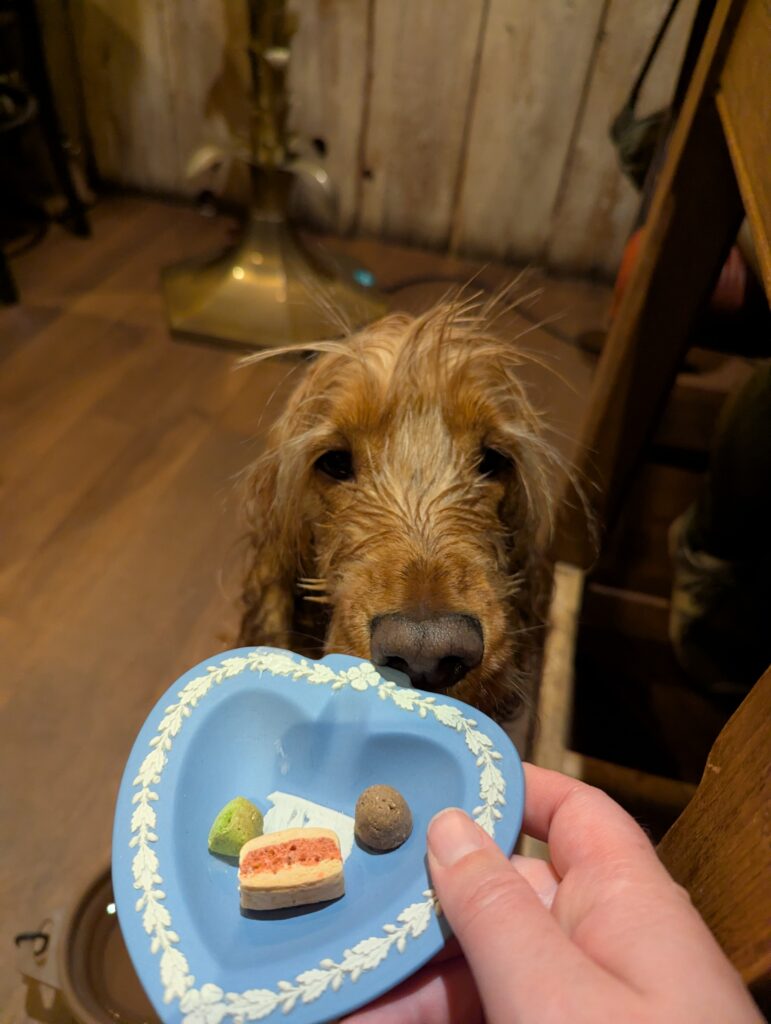 The pub is incredibly dog-friendly. Our dog arrived soggy from his walk but was warmly welcomed by staff and guests alike, and even treated to a delightfully kitsch plate of colourful dog treats.