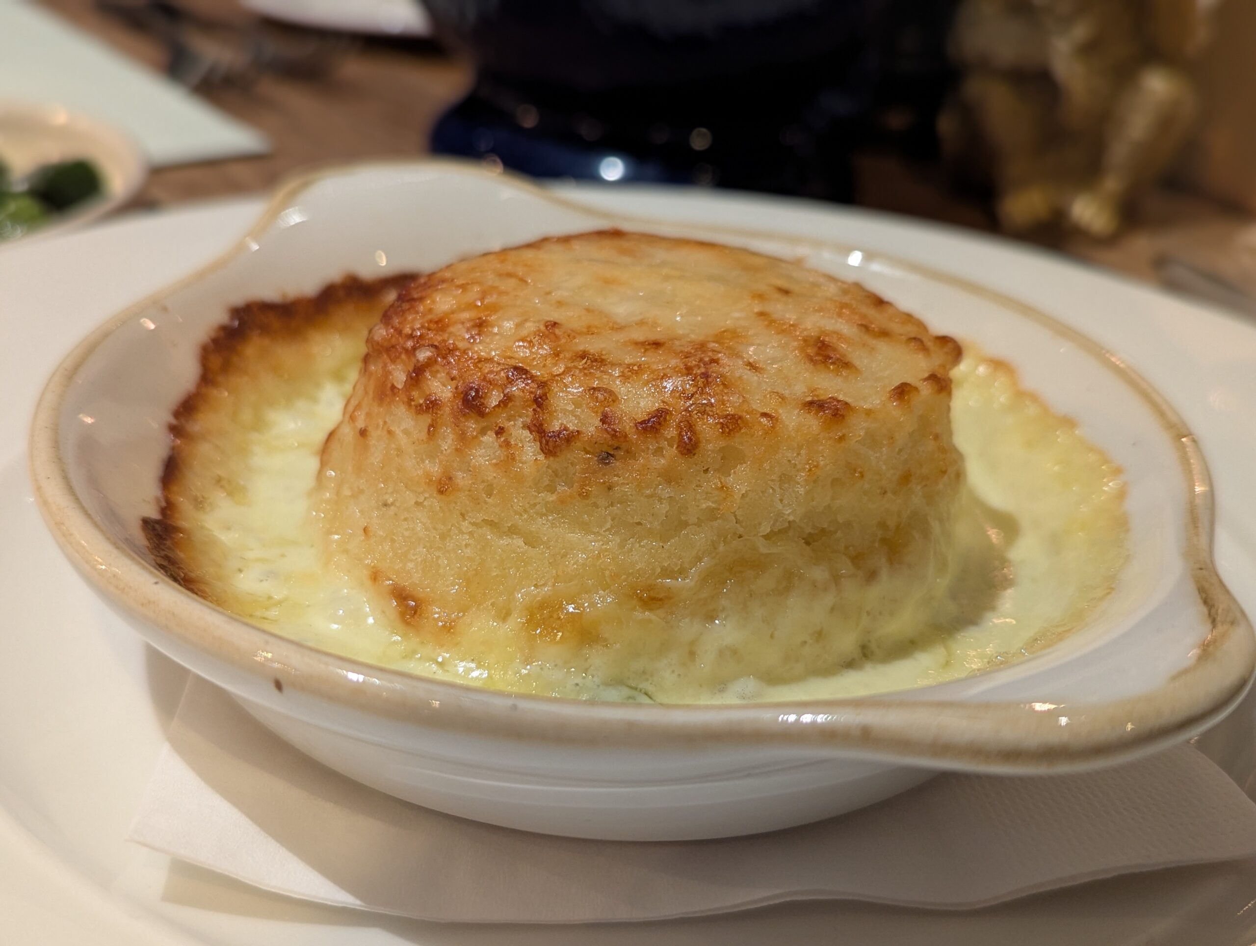We started with padrón peppers (£7) and, on recommendation, the twice-baked cave-aged cheddar soufflé (£13). I do not usually order soufflé, but now I understand the appeal. It was almost like a very light cheese scone, delivering a big cheesy hit without any heaviness. Our only regret was not having bread to mop up the remaining cheese.