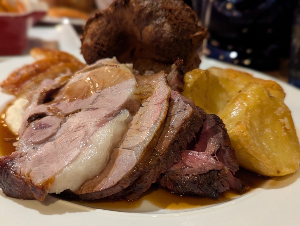 Portion sizes are extremely generous. You get a substantial slice of each meat, and in the case of the beef, more than one. Gravy is already on the plate, the roast potatoes were hot and crisp, something that is not always guaranteed with a roast. We did see the family next to us ask to take leftovers home, which says it all. Come hungry, and consider skipping or sharing starters. We were genuinely sad not to have enough room to fully indulge in the vegetables, which were only sampled but proved to be super buttery, with caramelised carrots and lightly coated cauliflower cheese.