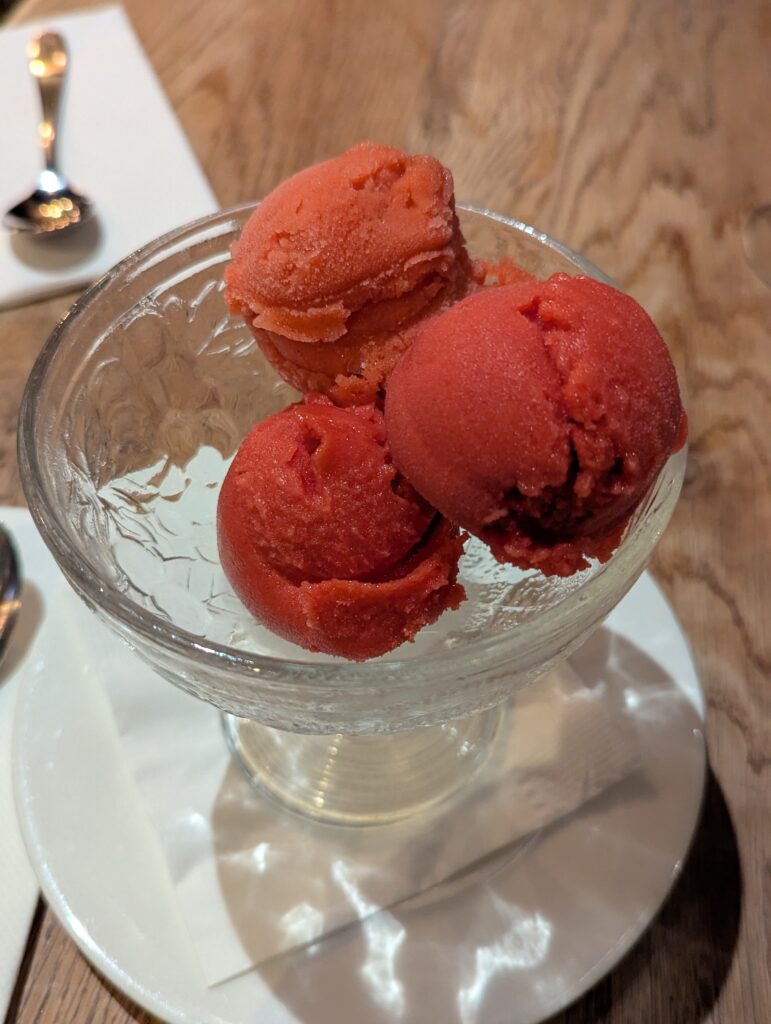 By this point we were full in a way reminiscent of Christmas-level indulgence, but when told that all desserts, including sorbets and ice creams, are made in-house, we could not resist. My friend chose three scoops of Kate’s sorbet (£9), raspberry and strawberry, while I went for the vanilla rice pudding with rhubarb compote (£8). It was wonderfully creamy, made with real vanilla pods and delivered a strong, satisfying vanilla flavour.
