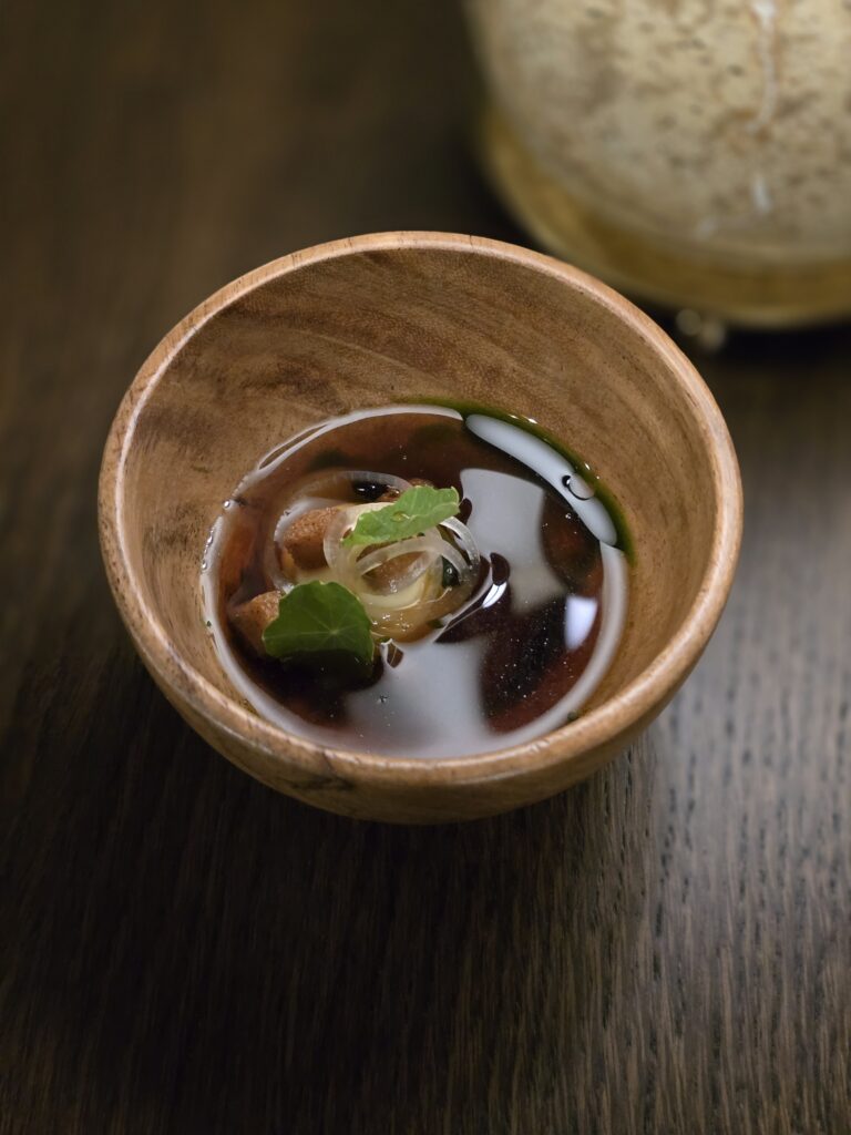 The first course, an onion broth accompanied by homemade soda bread and sesame marmite butter, was a standout. The broth’s deep, rich umami warmth, punctuated by nasturtium croutons, paired wonderfully with the crusty soda bread. It was the kind of dish you could easily drink a whole bowl of and still crave more.