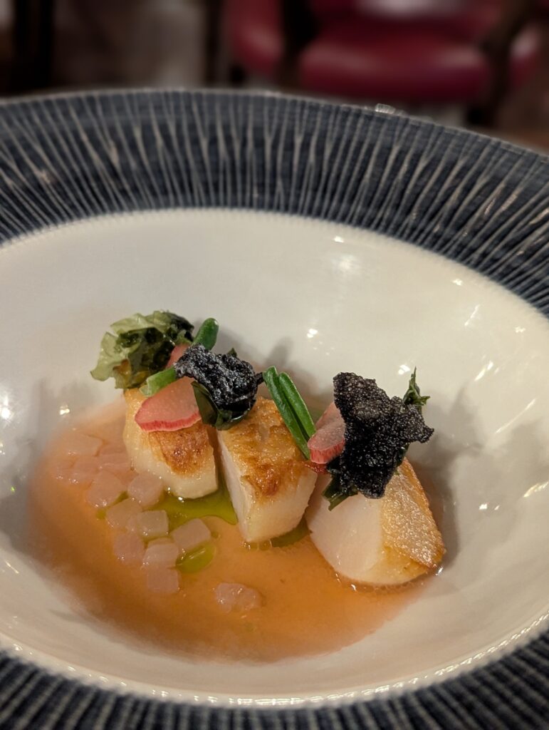 The Orkney scallop dish followed, served with a rhubarb jus, lardo, and squid ink crackers adorned with sea vegetables. The scallops had a lovely crispy glaze on the outside, which added to the flavor and texture of the dish. The gentle sweetness of the scallop was expertly counterbalanced by the tart rhubarb, while the squid ink crackers provided an added crunch. The accompanying North East Italian wine—a mix of three grapes—brought layers of cherry and botanical notes, rounding out the flavors beautifully.