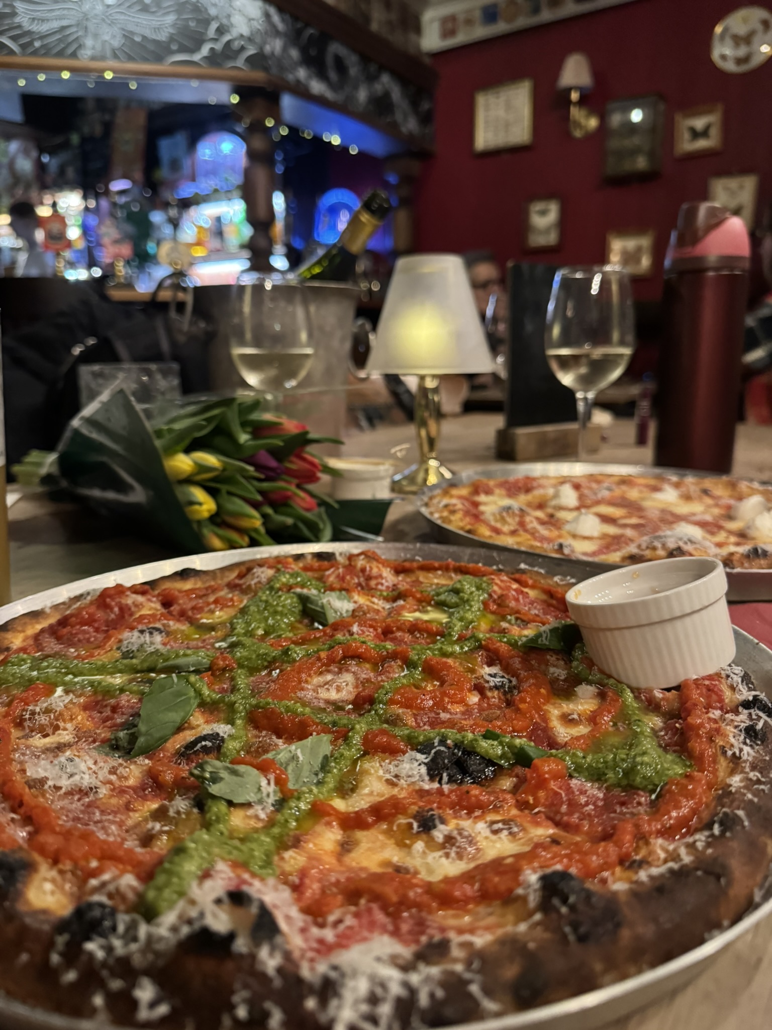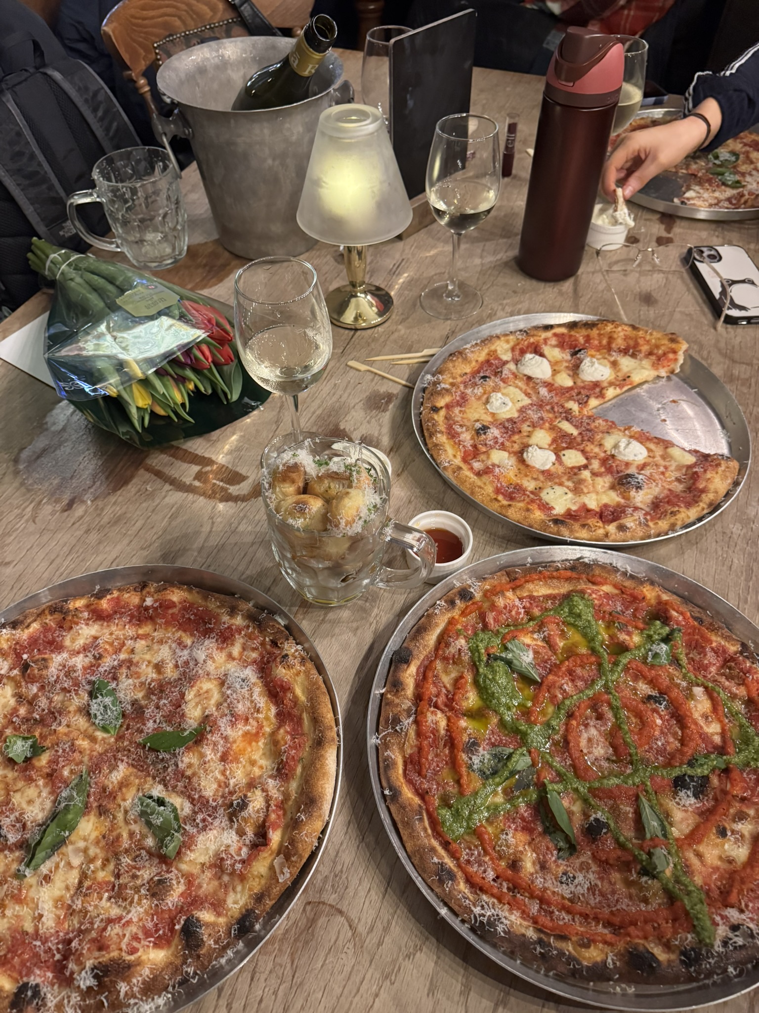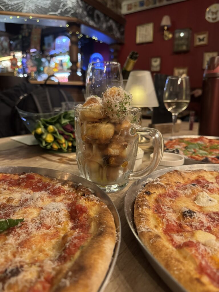 The pizzas were also delicious, we ordered a few of The Regular which is a marg (£10), a Pestogram (£12), and an OX4 Cheese (£12.50). We were all starving, so these pizzas were demolished. The flavours were great, the dough was bouncy and crispy, they arrived steaming hot, presented nicely (loving this new swirly pesto vibe places are doing lately, looks v cute). We also got the hot honey and garlic dips – the perfect accompaniment for your lonely crusts. If you’re on a small table, they even have pizza risers so you can have lots of pizzas on top of each other – genius.