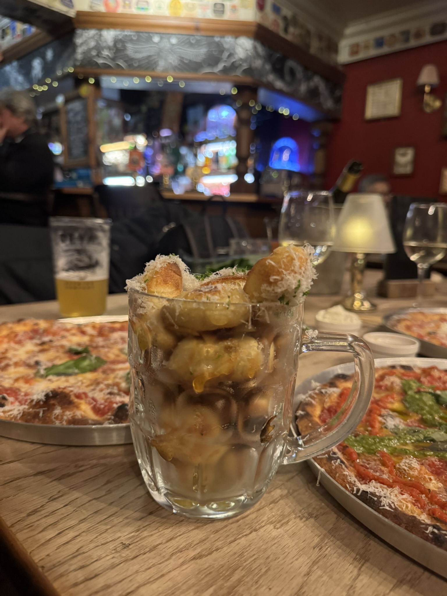 It’s a nice and concise pizza menu, with all the classics as well as some specials. You order at the bar, are given a buzzer, and then you go and collect it from a window in the garden. Something I hope they never take off the menu is the pint of garlic doughballs (£5). An actual pint, incredibly generously stuffed, and showered with parmesan. They were pillowy, doughy, perfection. Loved them. Inhaled them. I believe there’s a deal where you can get a pint of them and a pint of beer for a tenner – dreamy.